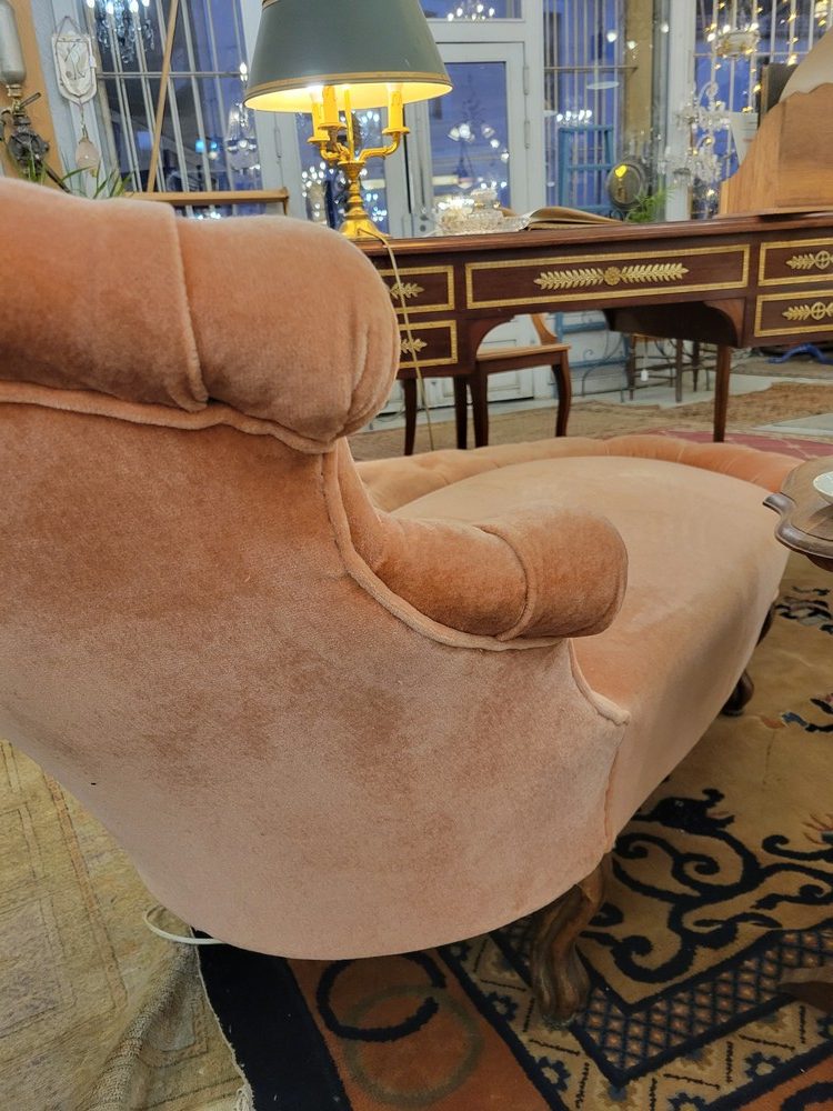 Méridienne d’époque Napoléon III. Tapissée d’un velours rose capitonné en bon état, très légèrement usé à un petit endroit. La structure en bois et le garnissage sont en bon état. Elle est très confortable et incite à la lecture ou à la sieste… Petits pieds galbés en bois.