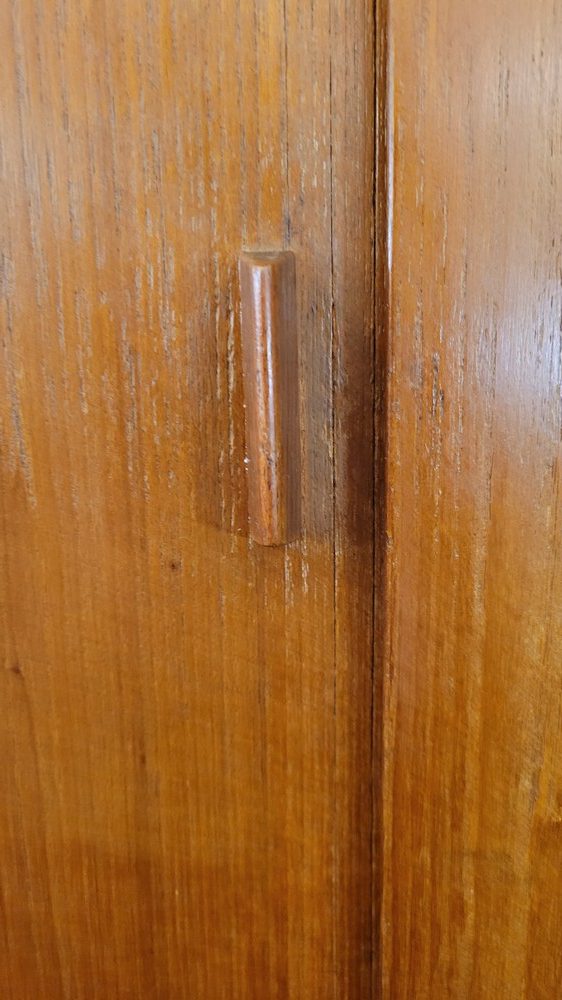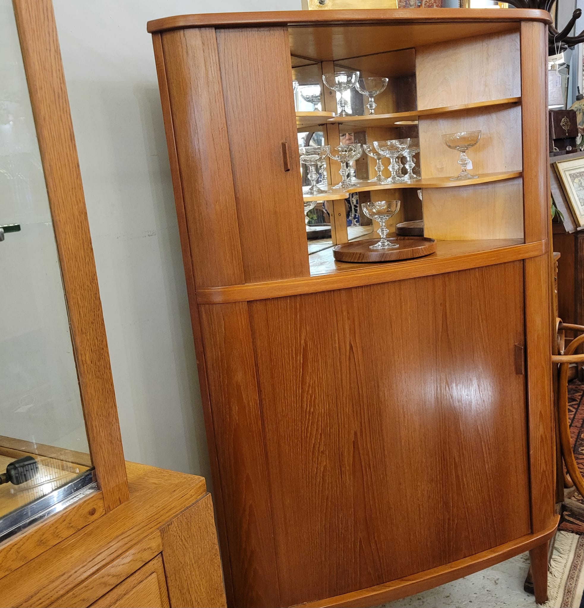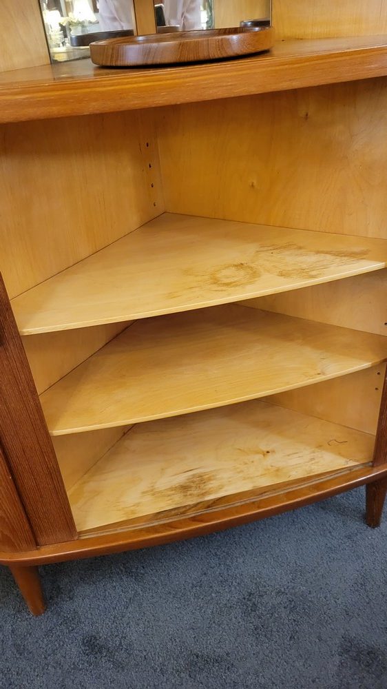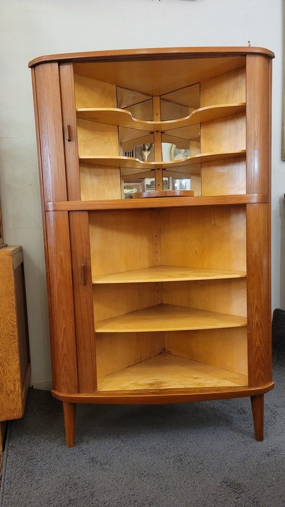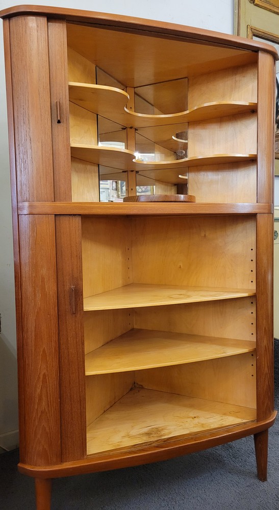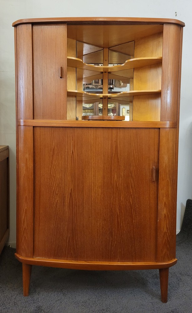 Meuble d’angle à 2 corps, en teck, signé Skovmand & Andersen. Fondée en1960, au Danemark, la maison Skovmand & Andersen s’est spécialisée dans la création de meubles en bois haut de gamme, caractérisés par des lignes épurées et un design fonctionnel. La partie supérieure est tapissé de miroirs et présente un plateau tournant au milieu d’étagères découpées. Bon état général, avec quelques traces d’usage dont 3 éclats de placage sur le dessus et tâches sur une étagère.
