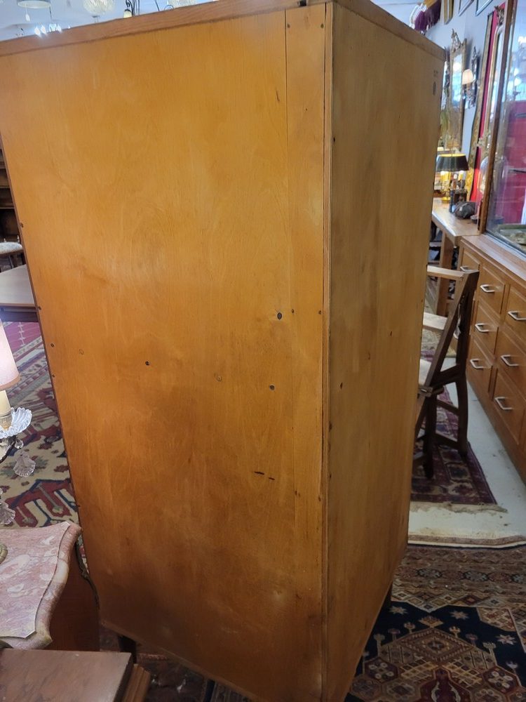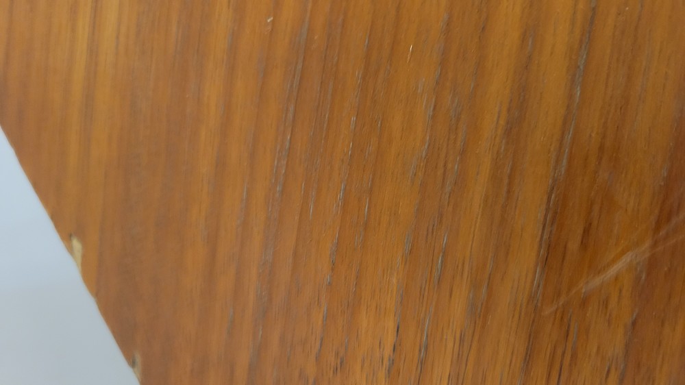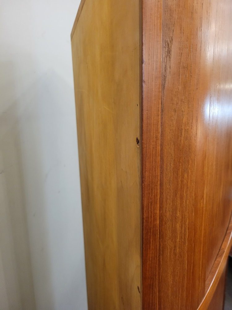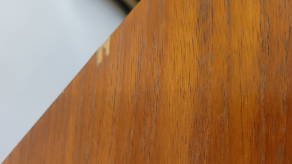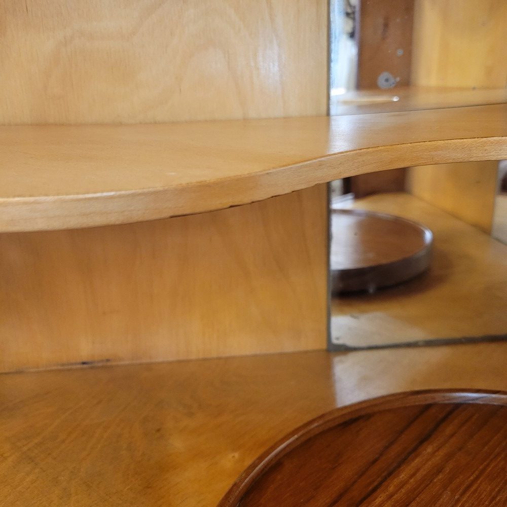 Meuble d’angle à 2 corps, en teck, signé Skovmand & Andersen. Fondée en1960, au Danemark, la maison Skovmand & Andersen s’est spécialisée dans la création de meubles en bois haut de gamme, caractérisés par des lignes épurées et un design fonctionnel. La partie supérieure est tapissé de miroirs et présente un plateau tournant au milieu d’étagères découpées. Bon état général, avec quelques traces d’usage dont 3 éclats de placage sur le dessus et tâches sur une étagère.