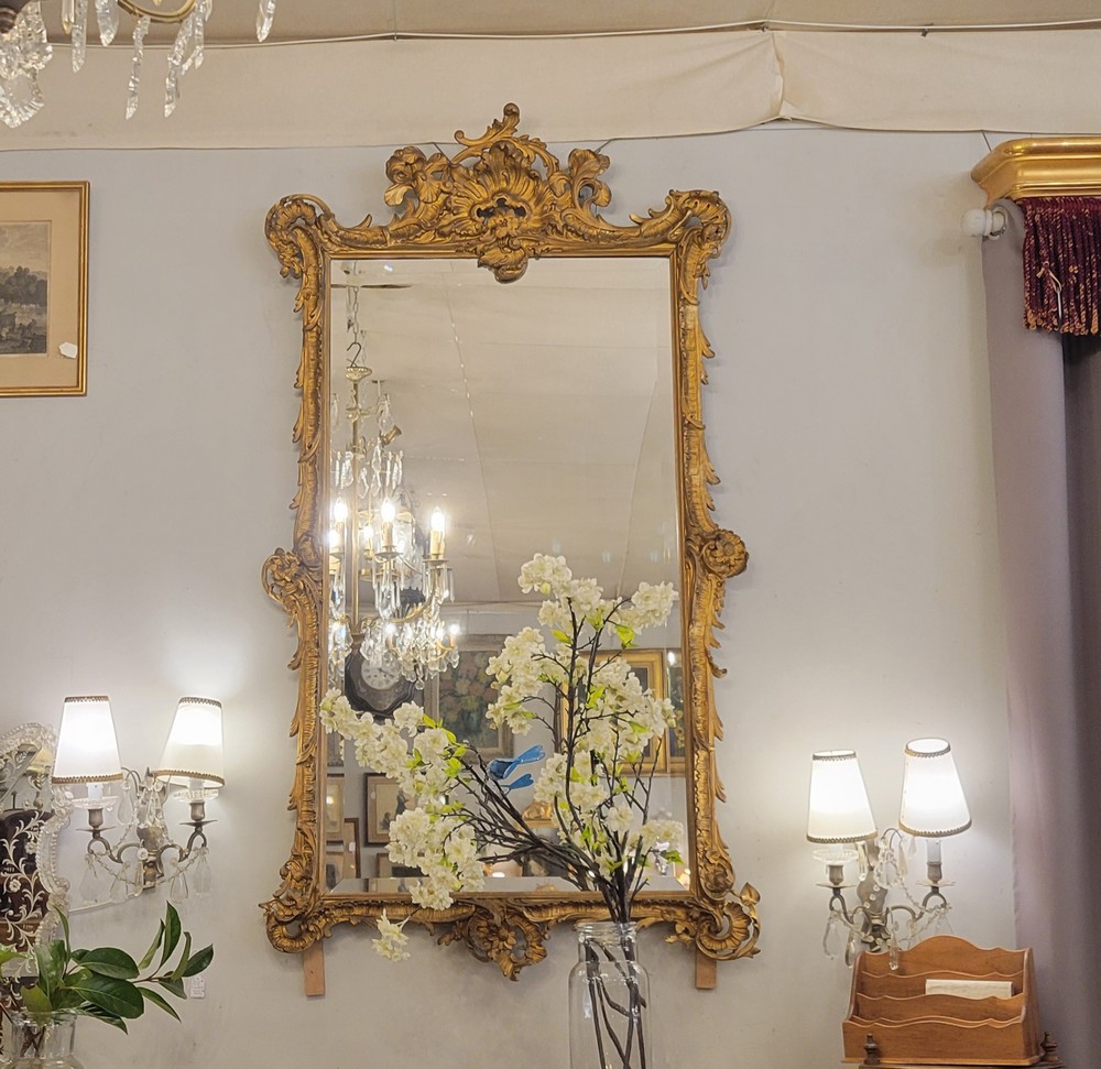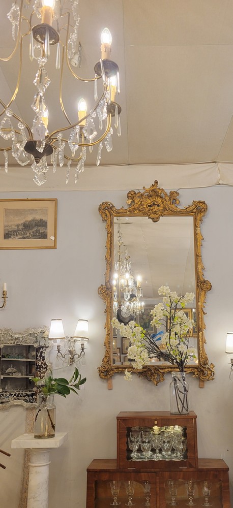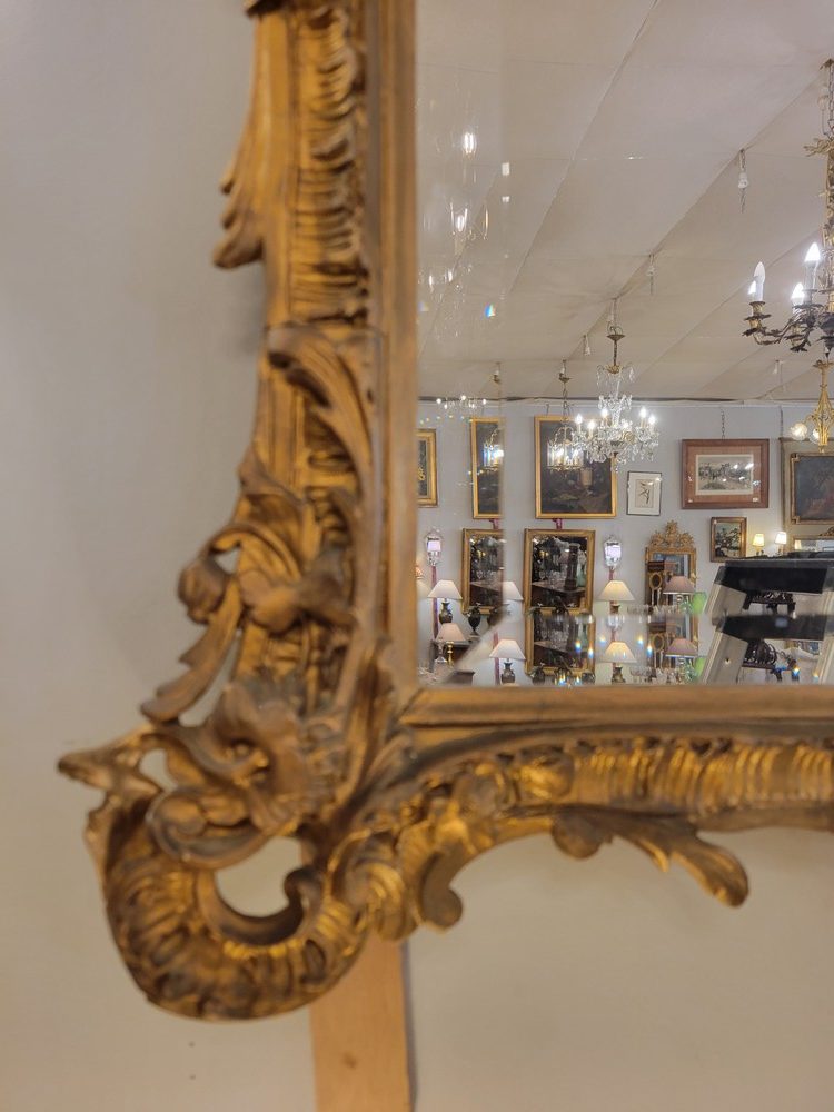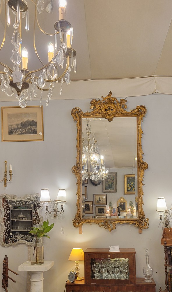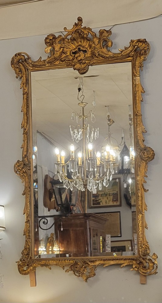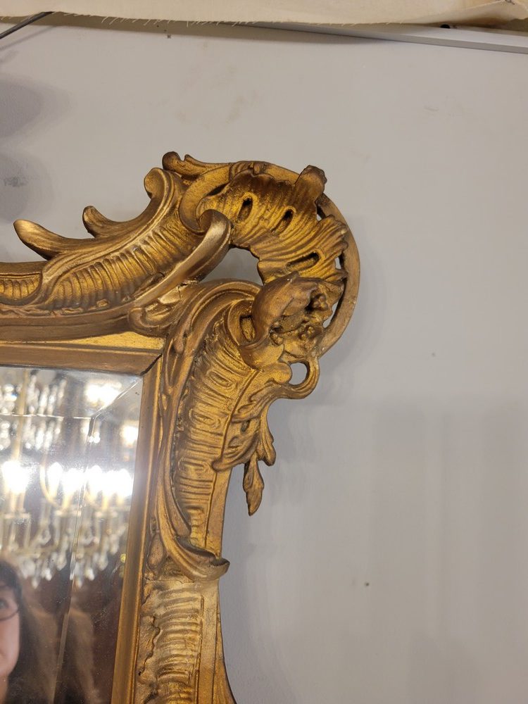Miroir Rocaille de style Louis XV, glace d’origine biseautée. Bois et stuc doré, époque XIXè