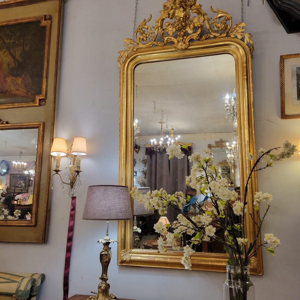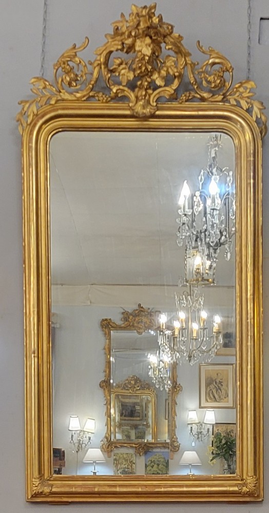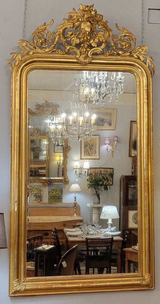 Miroir Napoléon III à riche décor de feuilles de vigne et de feuilles d’acanthe en bois et stuc doré. Epoque XIXè siècle. Il possède sa glace d’origine. De petites restaurations de dorure sont à noter. Bon état général. Dos d’origine.
