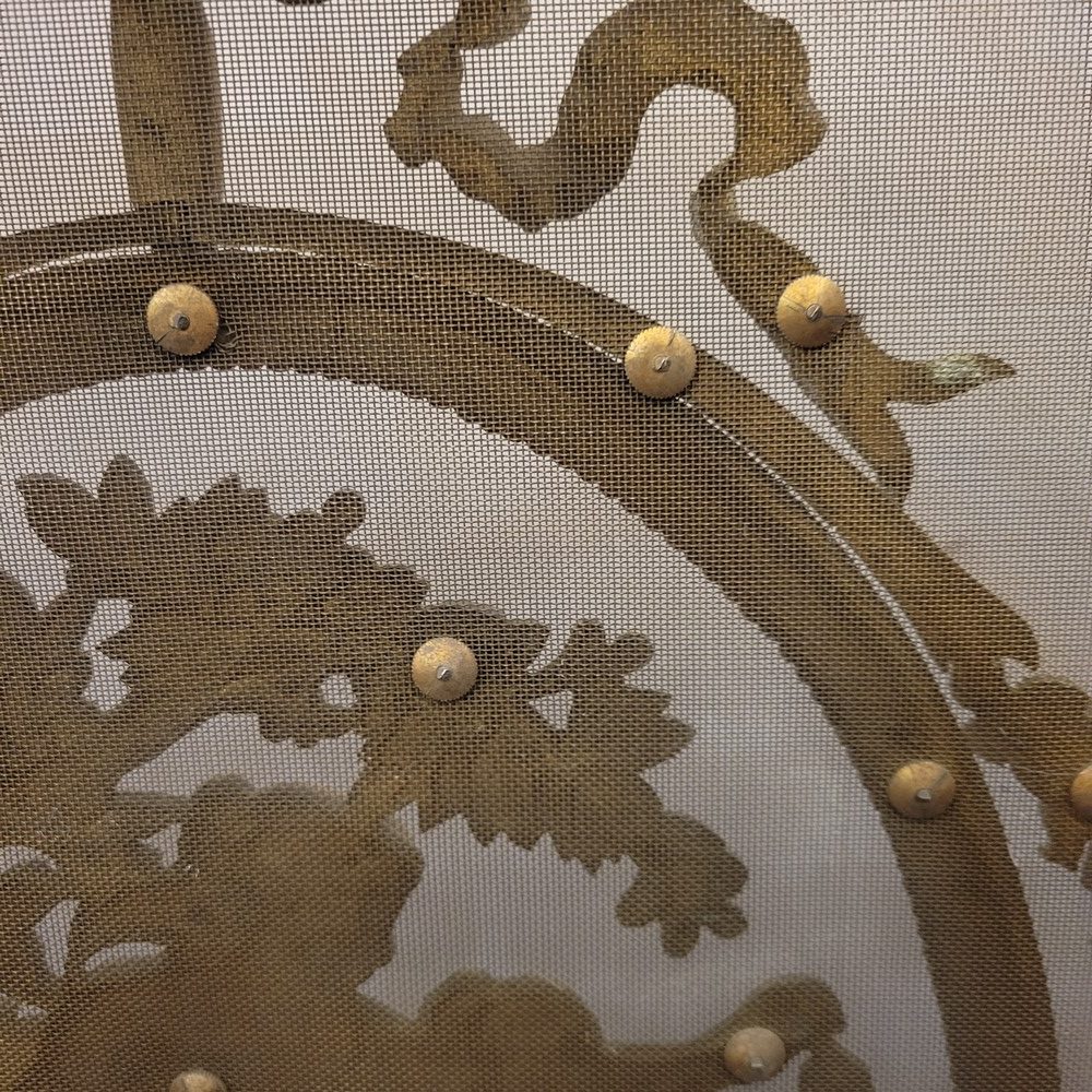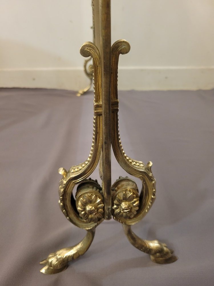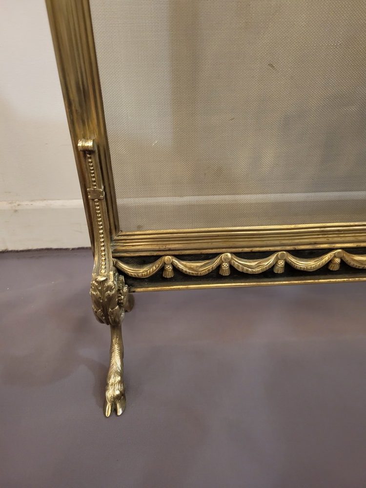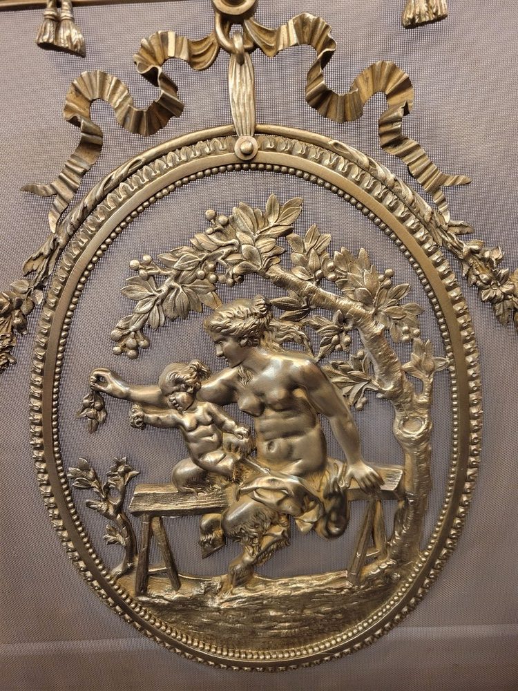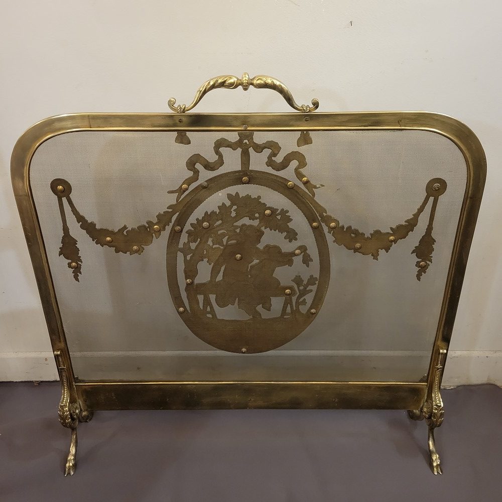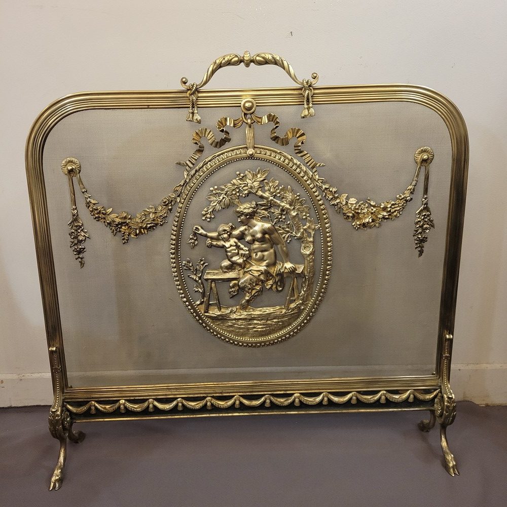 Pare-feu ou pare-étincelles en laiton, à riche décor néo-classique, avec les pieds en forme de sabot. Le médaillon central évoque une nymphe satyre dénudée avec un enfant. Epoque Napoléon III et style Louis XVI. La grille d’origine n’est pas trouée. Bon état général.