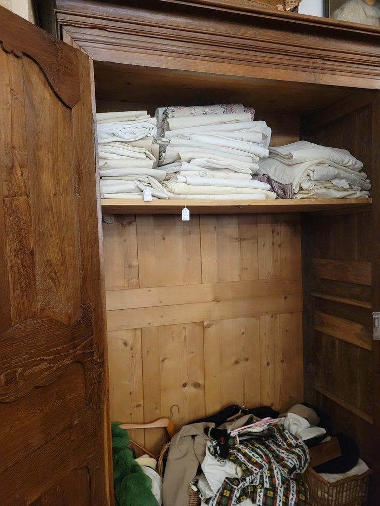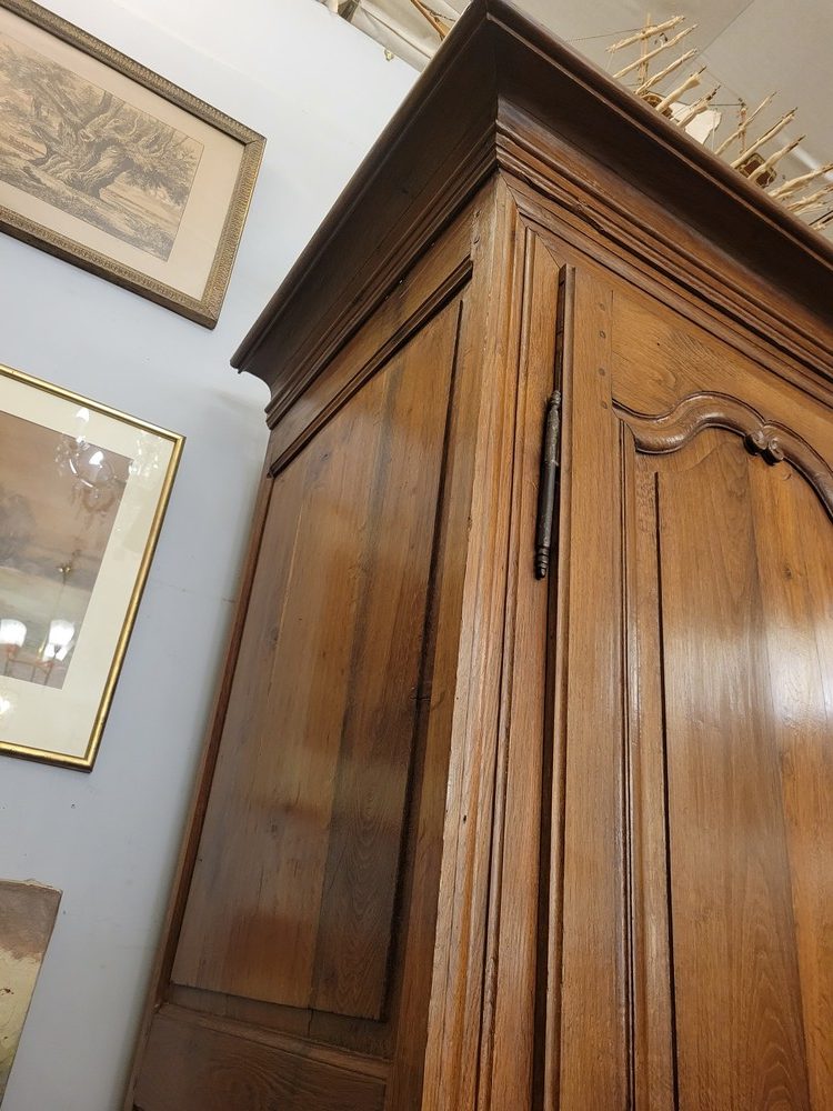Petite Armoire en chêne blond massif, d’époque XVIIIè et de style Louis XIV. Meuble authentique aux lignes sobres et classiques, actuellement, aménagée en penderie(prévoir la tringle) avec 1 étagère. Présence de tasseaux qui permettraient d’installer d’autres étagères. La serrure munie d’une clé  fonctionne. Armoire saine entièrement traitée avec quelques restaurations d’usage. Chevillée, elle se démonte facilement.