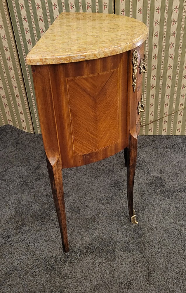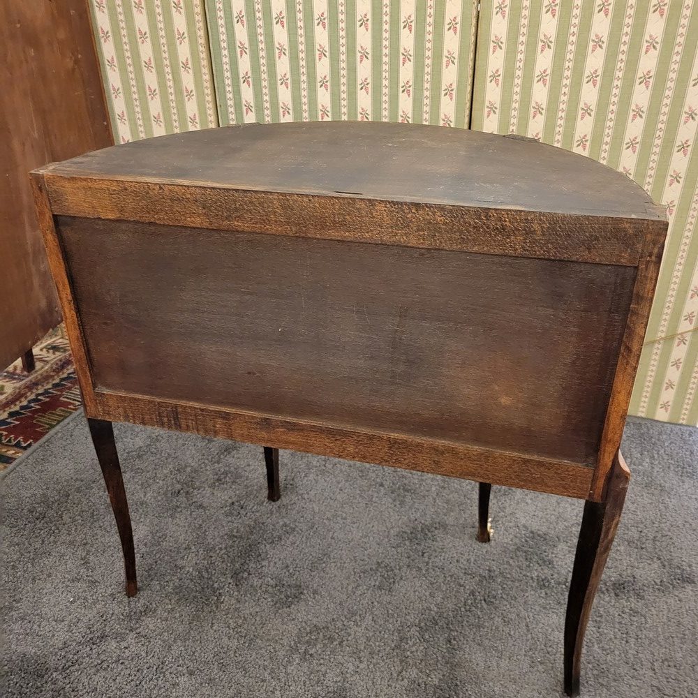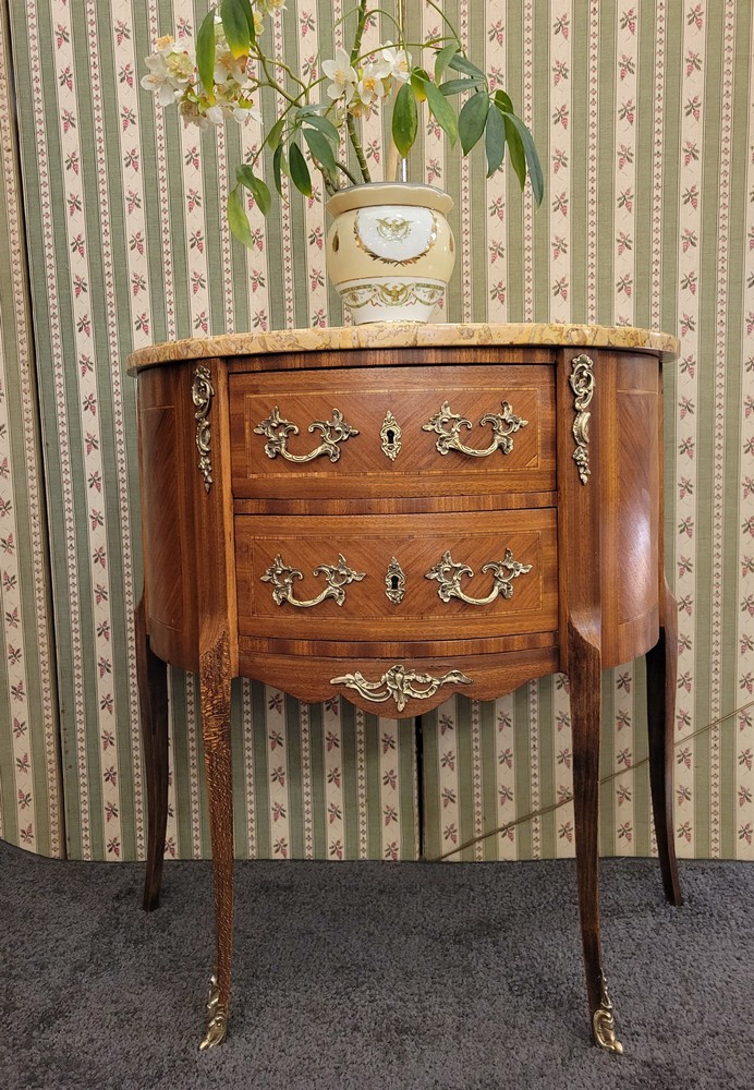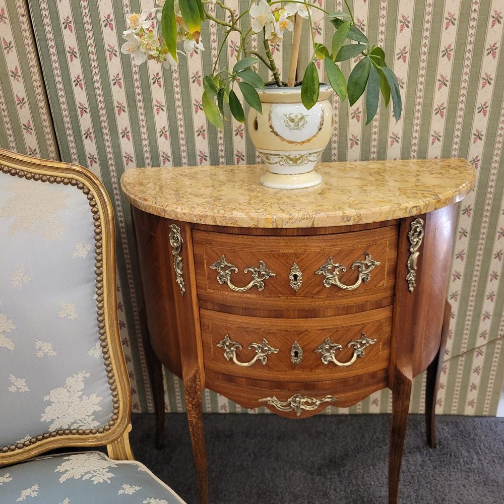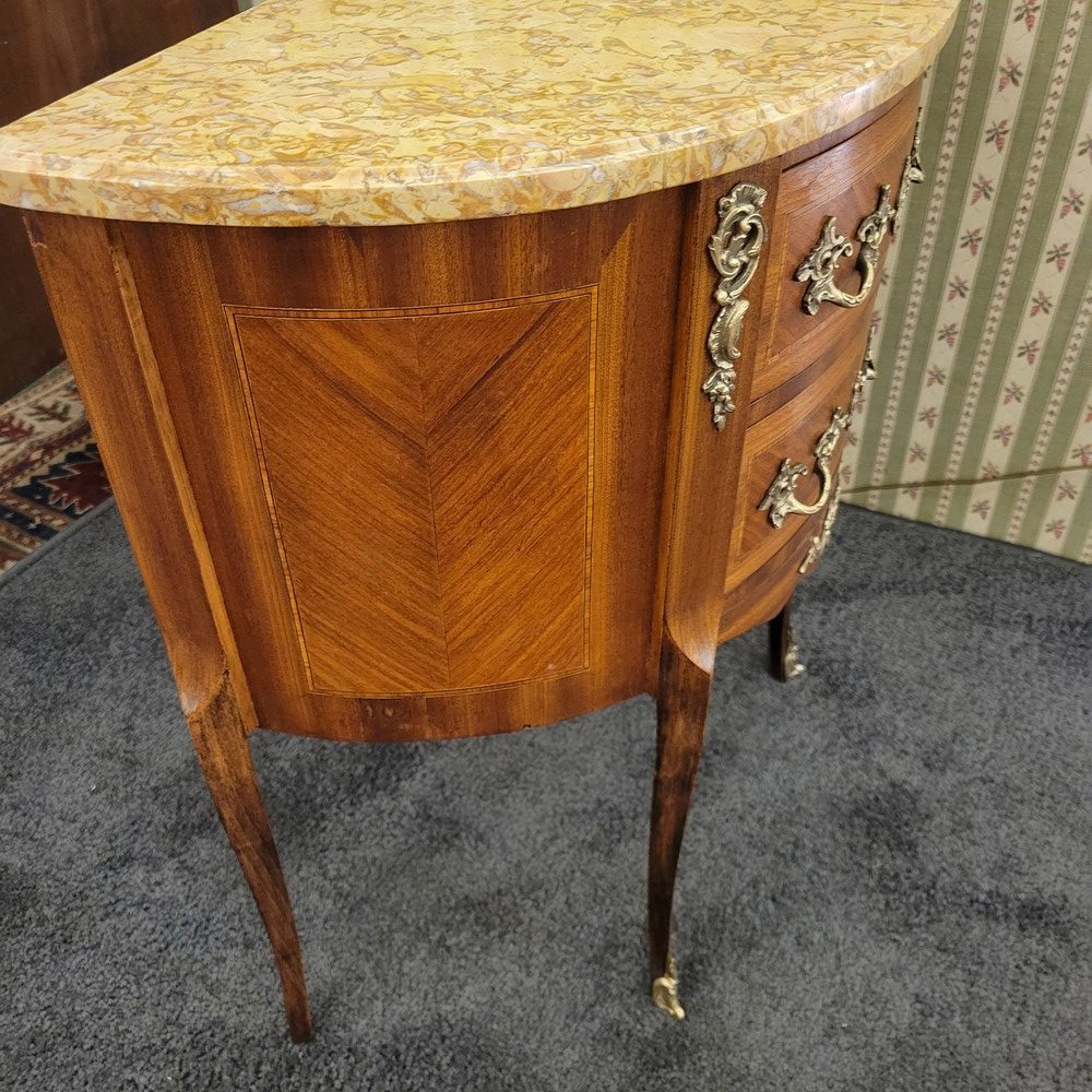 Petite commode demi-lune en bois de rose marqueté, de style Transition et d’époque 1930. Munie de 2 tiroirs arrondis. Plateau en marbre, garnitures en bronze. L’ensemble est propre et en bon état.