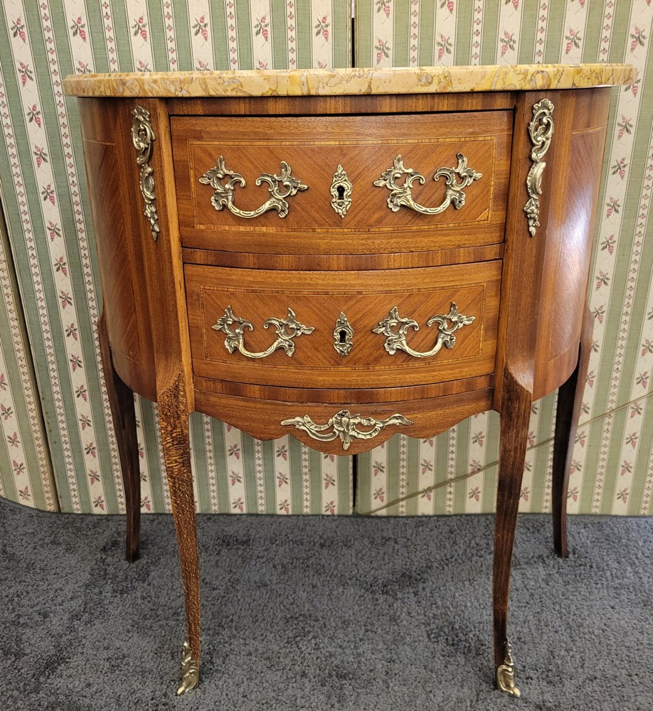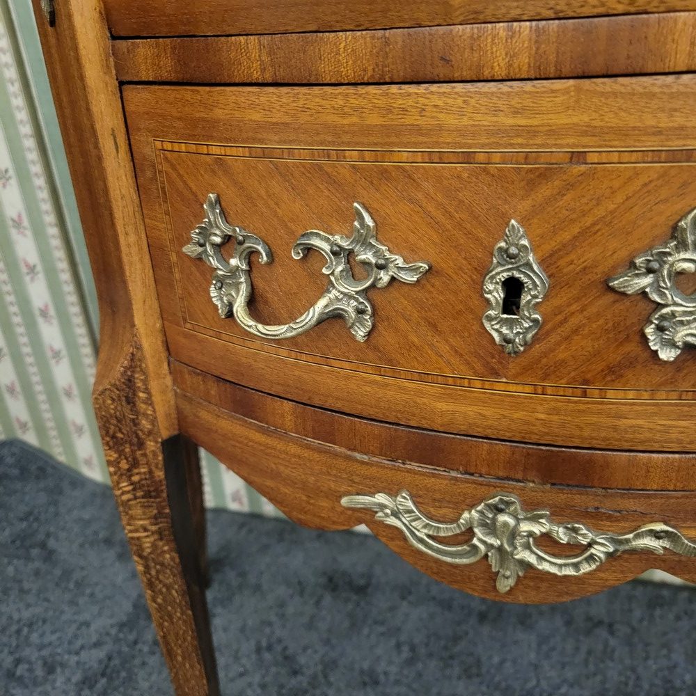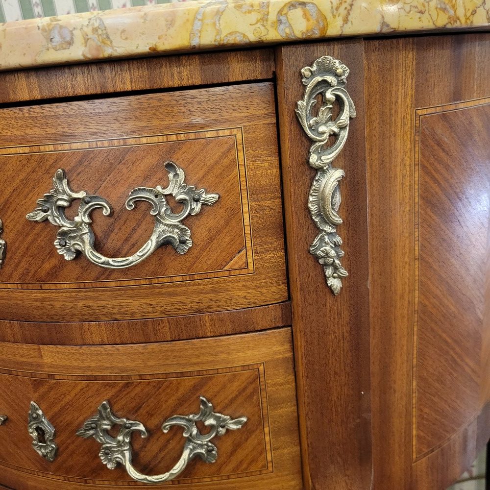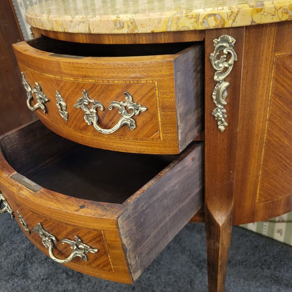 Petite commode demi-lune en bois de rose marqueté, de style Transition et d’époque 1930. Munie de 2 tiroirs arrondis. Plateau en marbre, garnitures en bronze. L’ensemble est propre et en bon état.