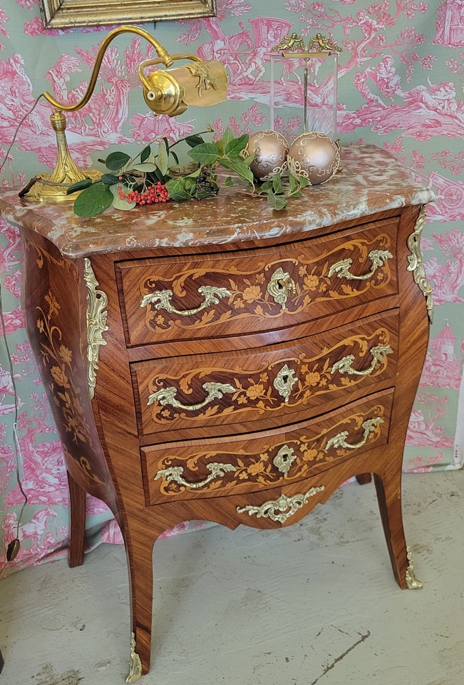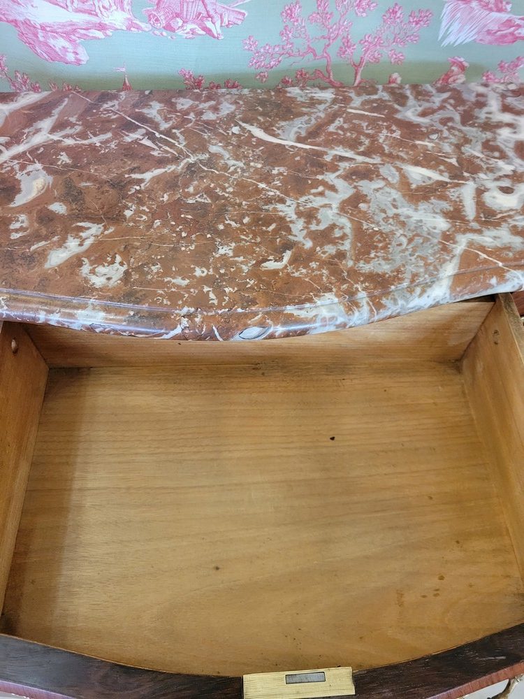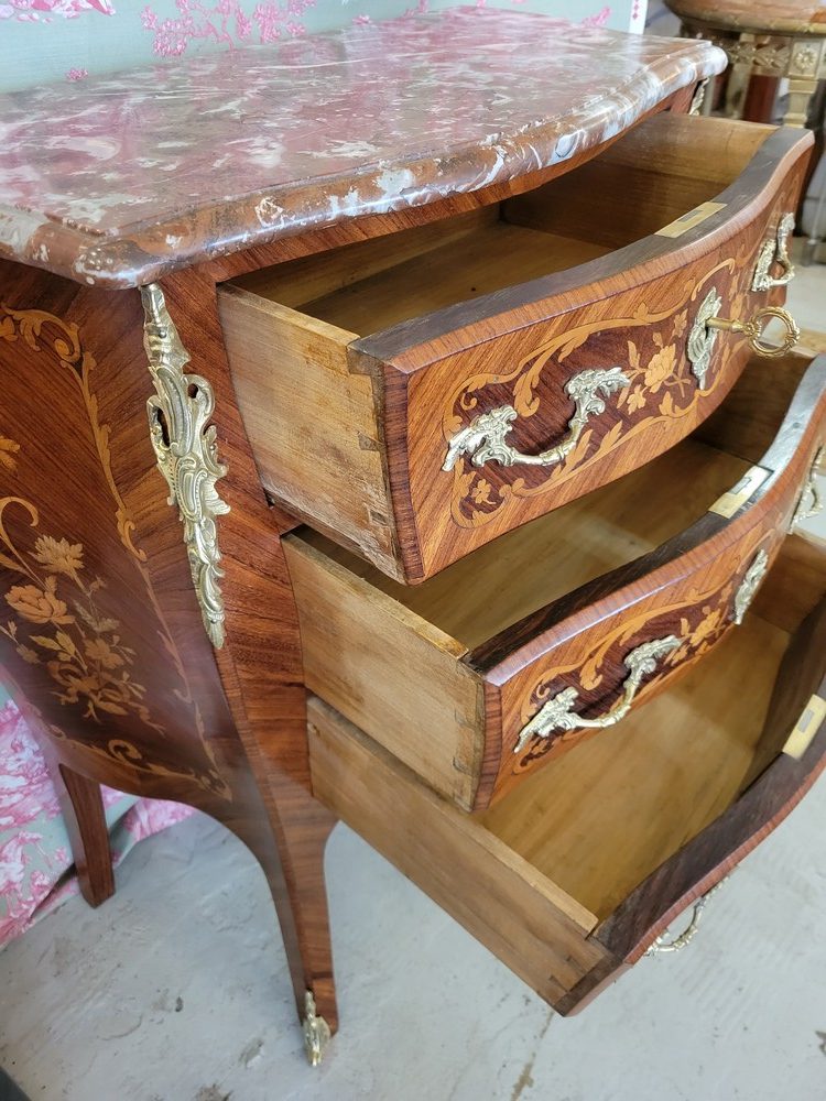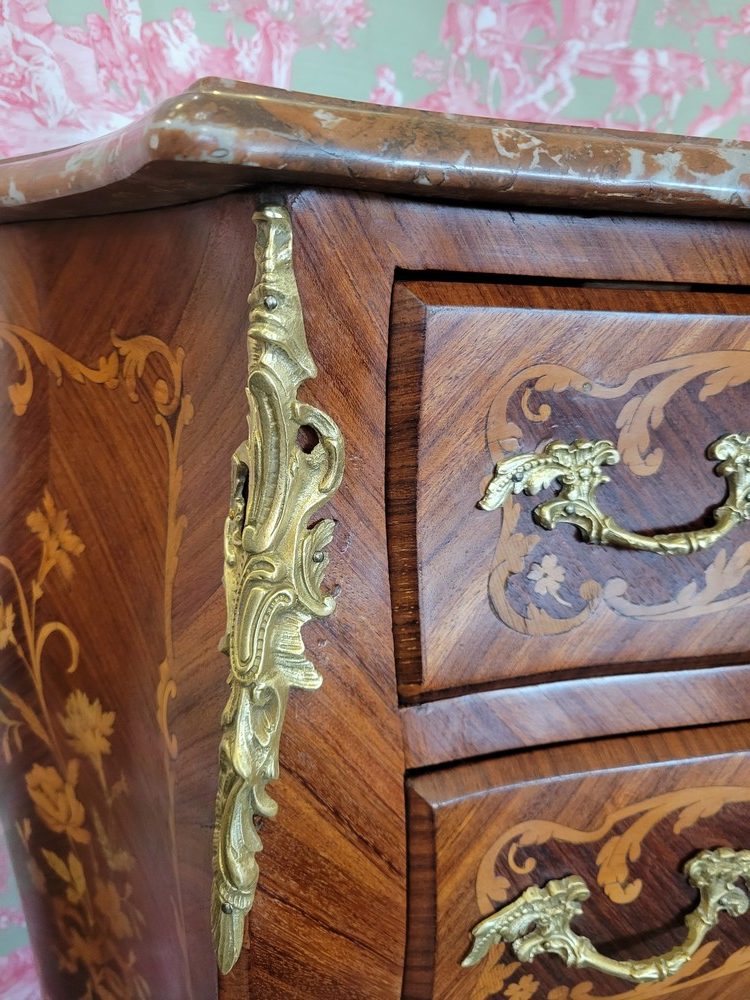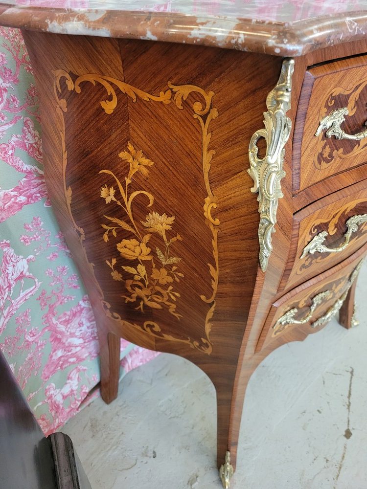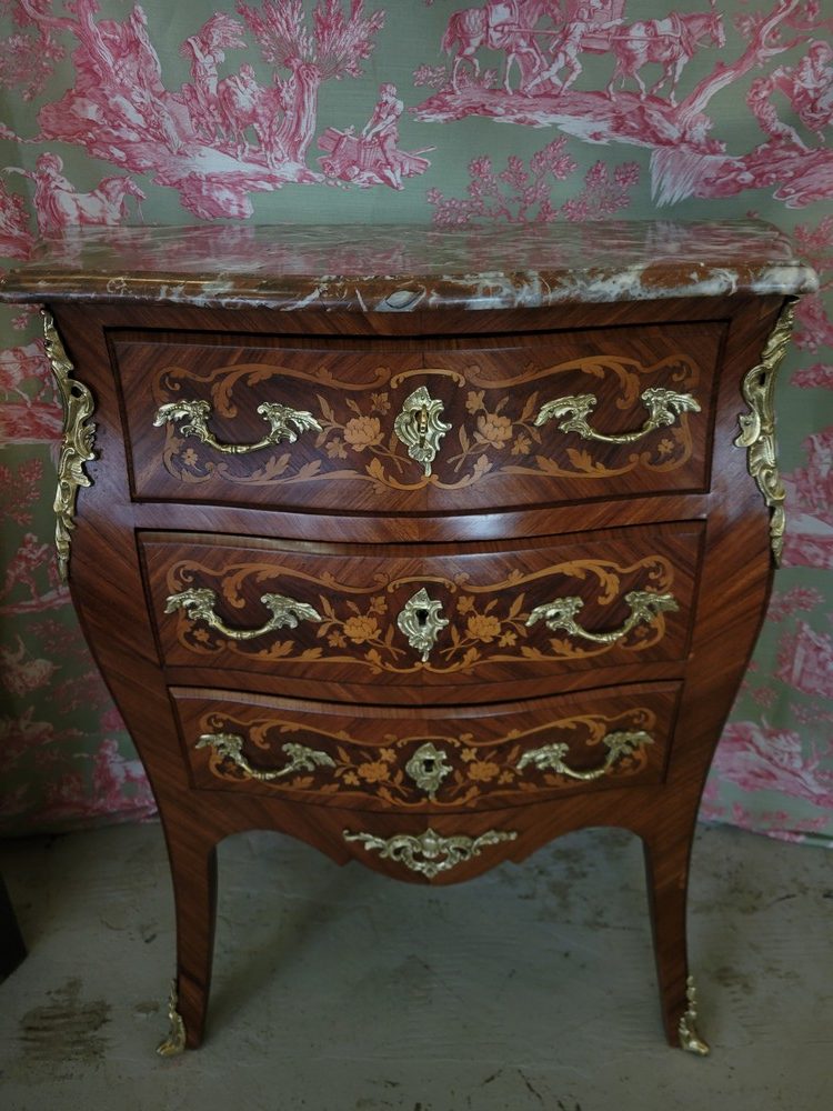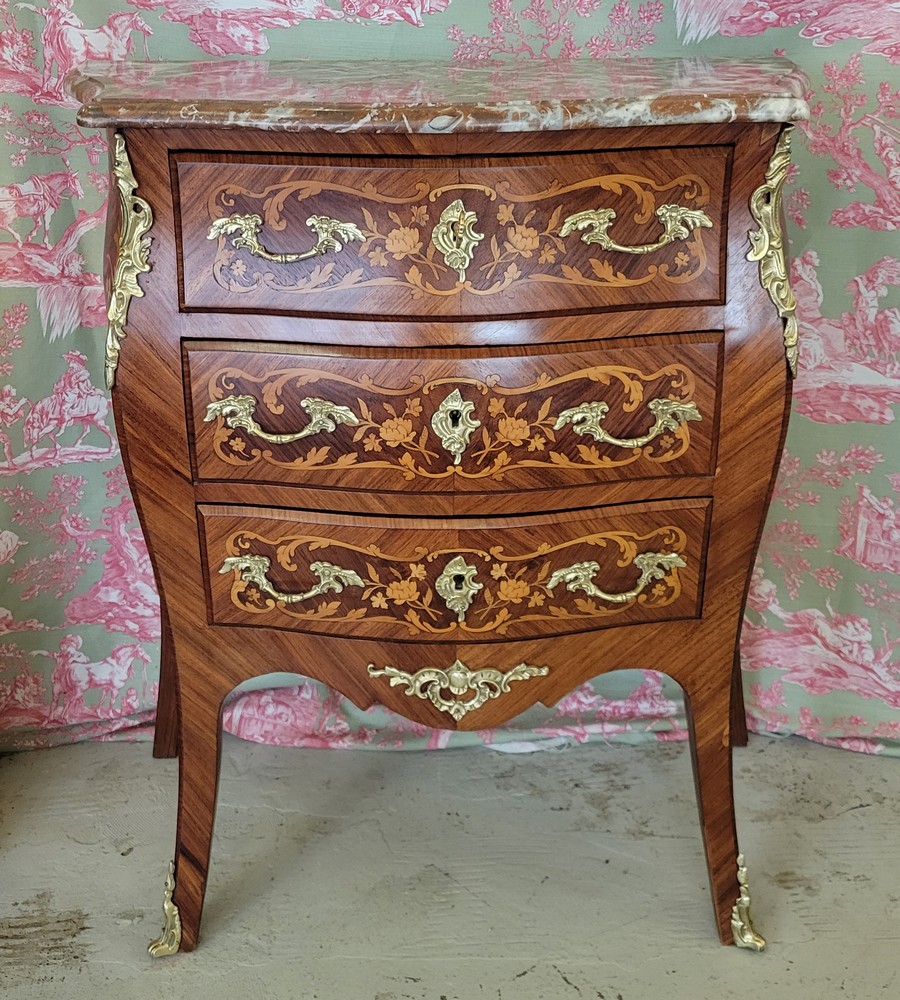 Jolie petite commode de style Louis XV, d’époque 1900. En bois de rose et palissandre marqueté, elle est décorée de motifs floraux sur les 3 faces. Les 3 tiroirs en façade sont bien propres et possèdent  une seule mais jolie clé avec les serrures qui fonctionnent. Le plateau en marbre rouge est en bon état. Il y a une marque noire (cf. photo) qui est dans la masse. Ce n’est pas une tâche. Les  garnitures sont en bronze. Bon état.