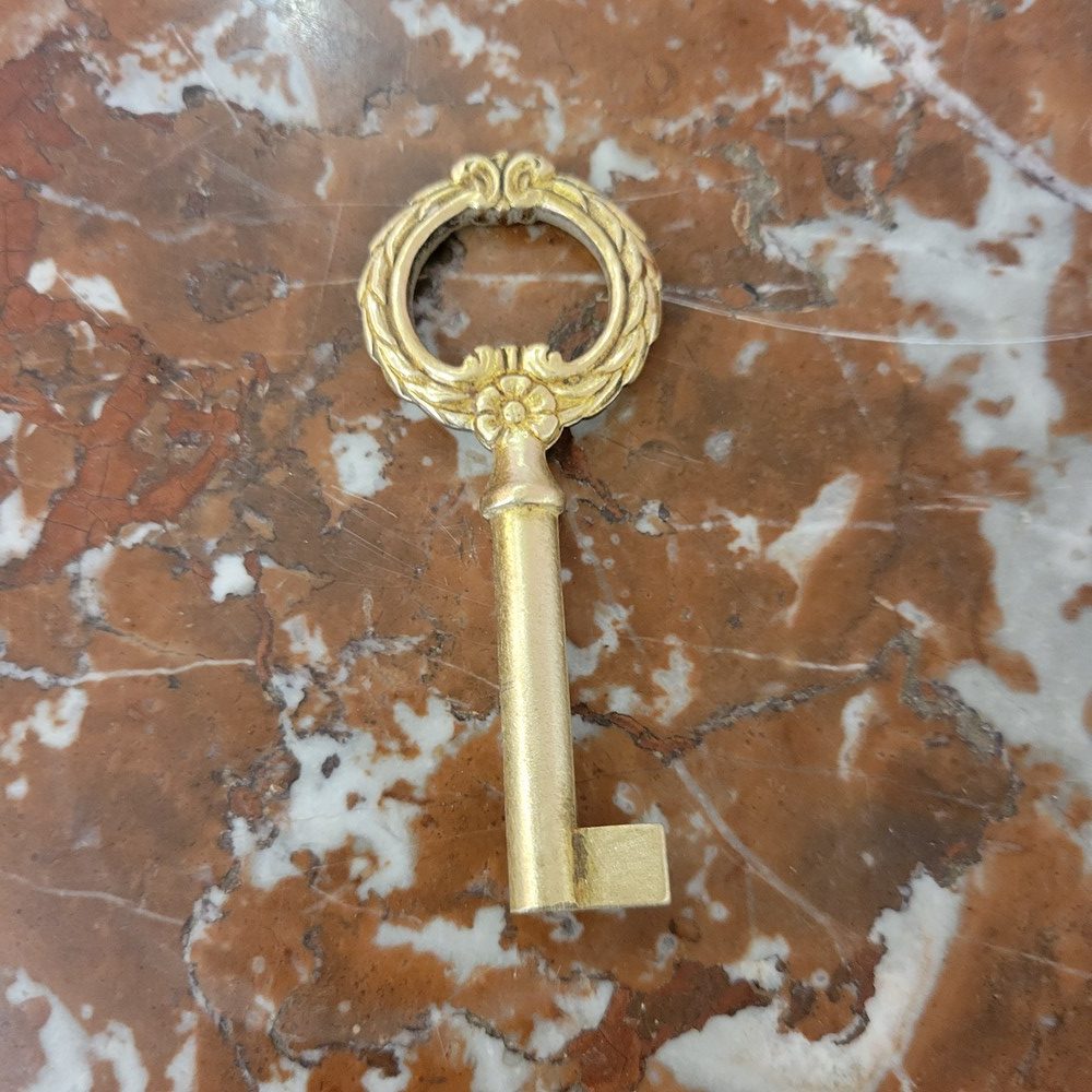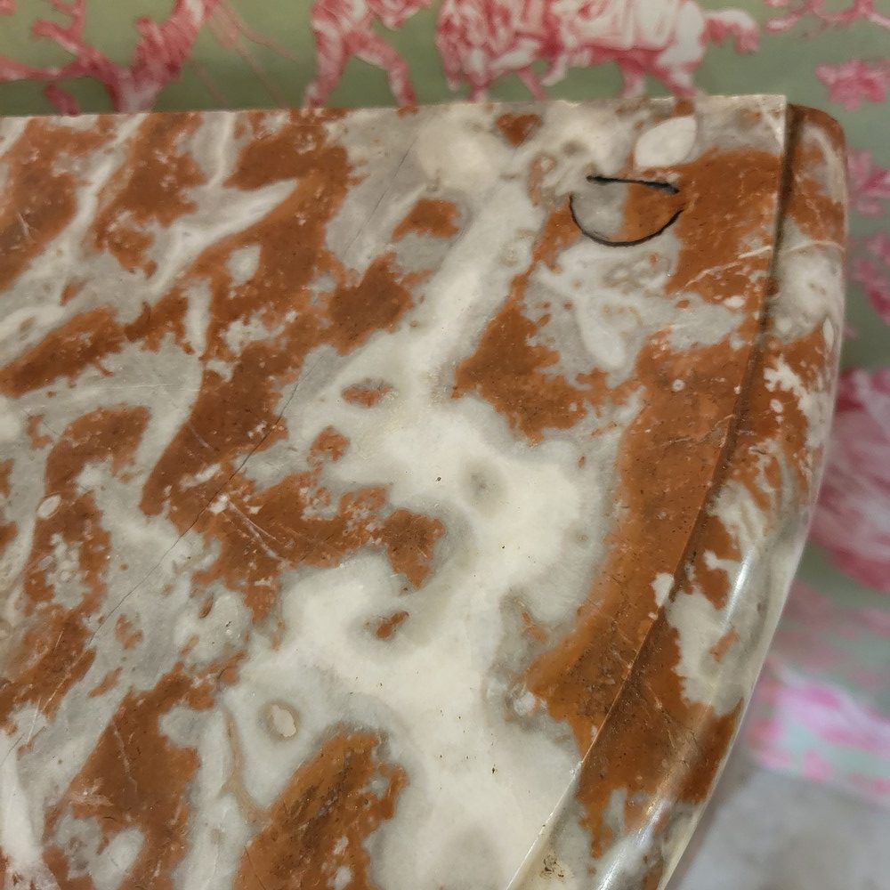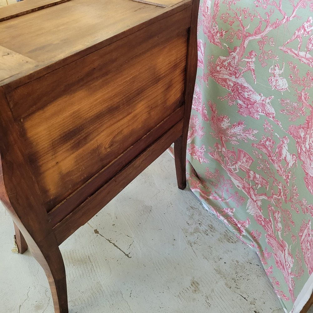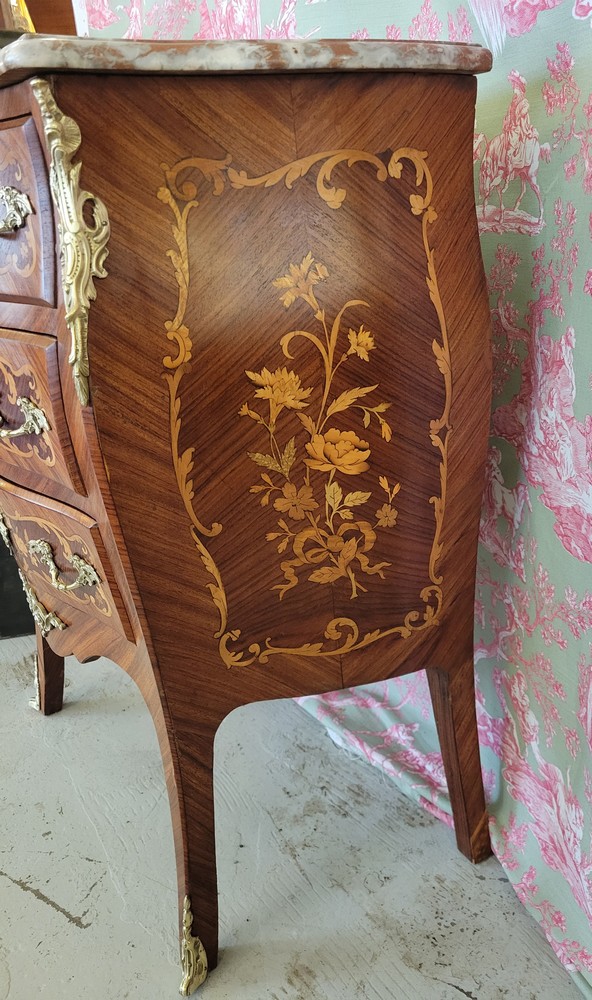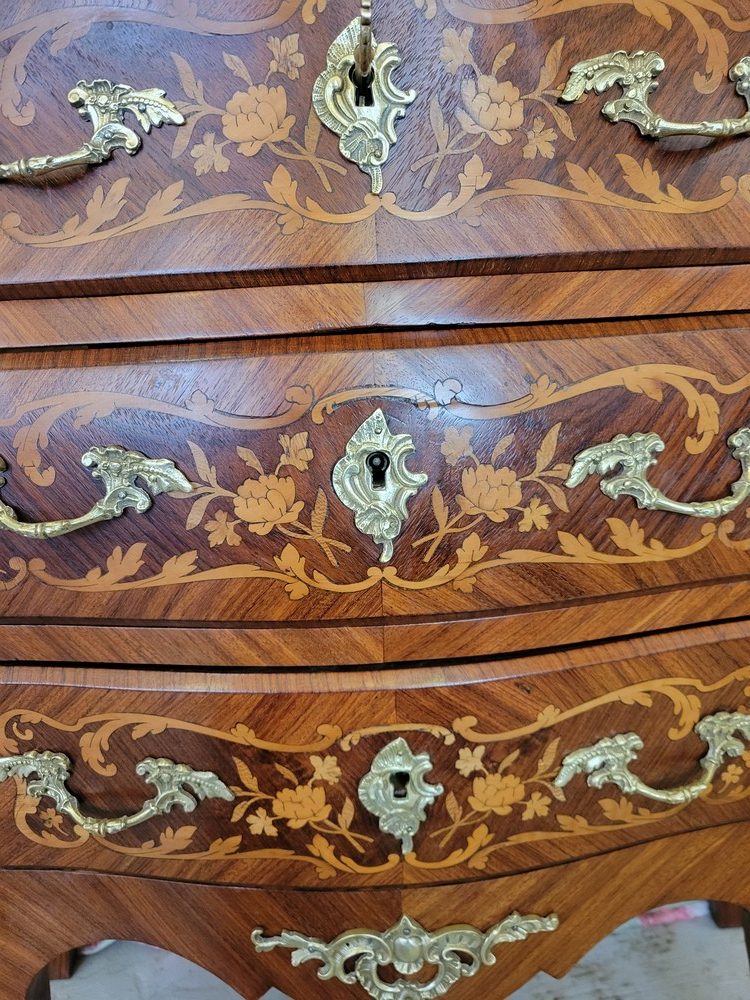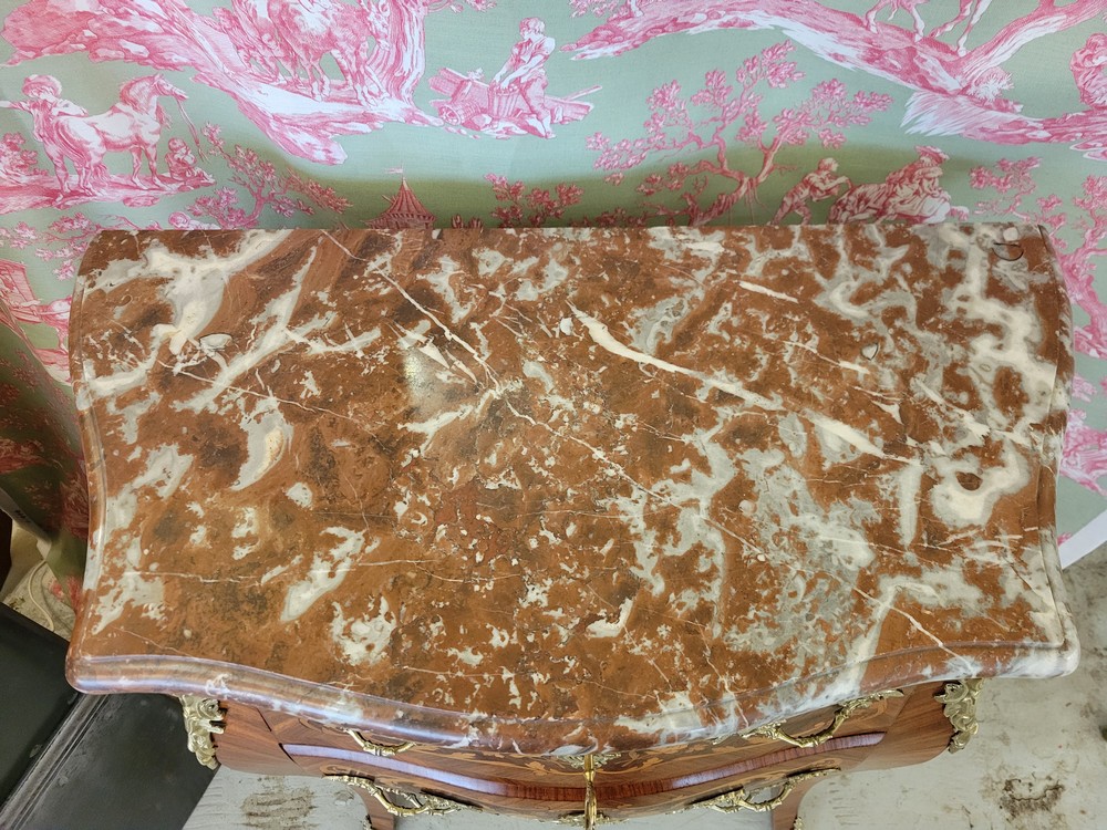 Jolie petite commode de style Louis XV, d’époque 1900. En bois de rose et palissandre marqueté, elle est décorée de motifs floraux sur les 3 faces. Les 3 tiroirs en façade sont bien propres et possèdent  une seule mais jolie clé avec les serrures qui fonctionnent. Le plateau en marbre rouge est en bon état. Il y a une marque noire (cf. photo) qui est dans la masse. Ce n’est pas une tâche. Les  garnitures sont en bronze. Bon état.