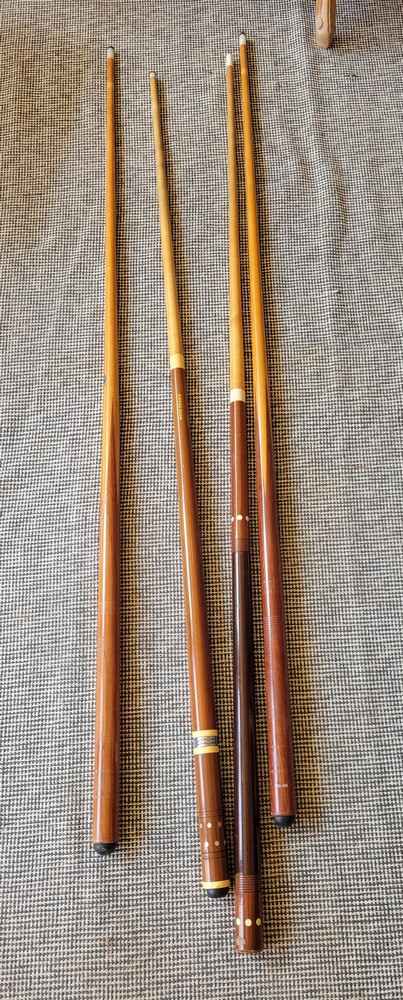 Support rond pour ranger 6 queues de billard. Il est en palissandre et sycomore et  date des années 80. Vendu avec 4 queues. Bon état.