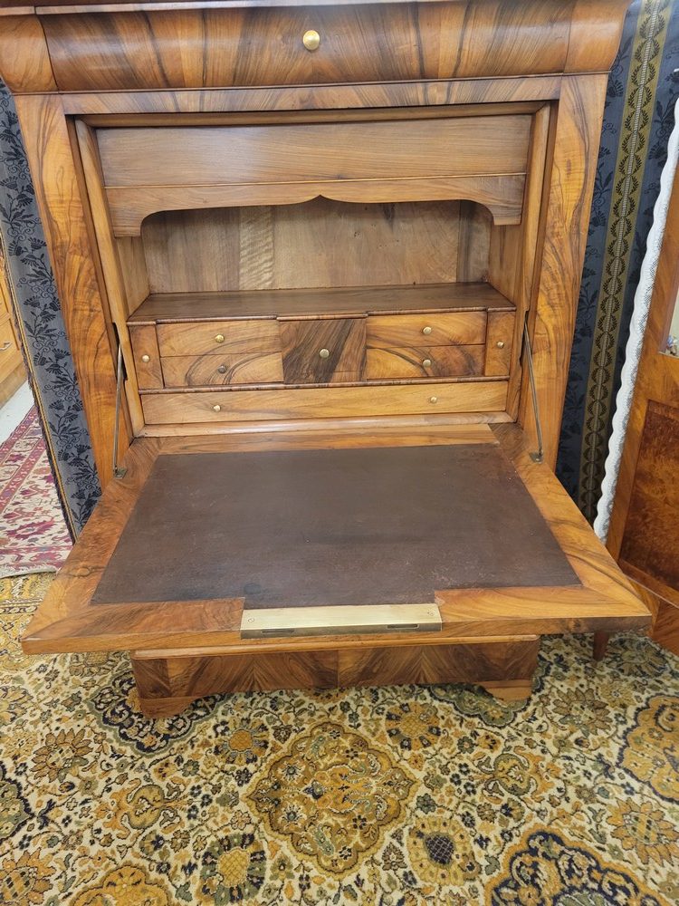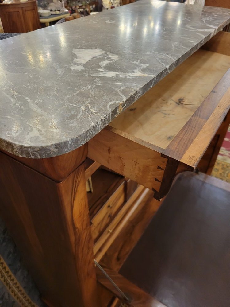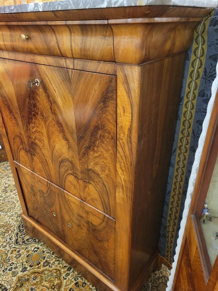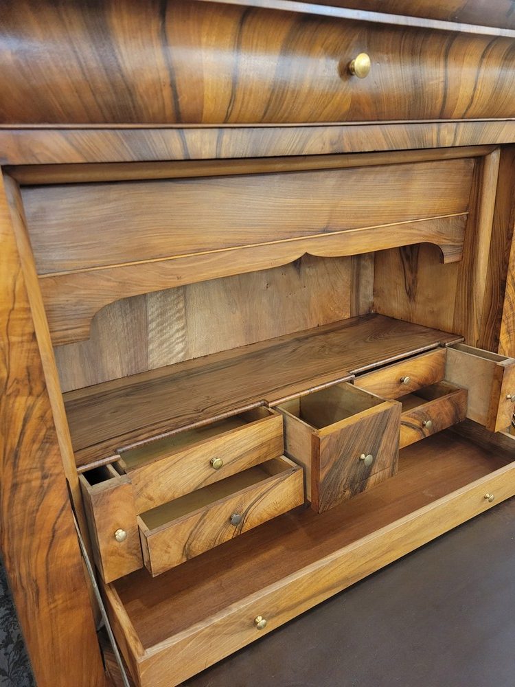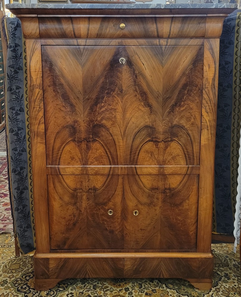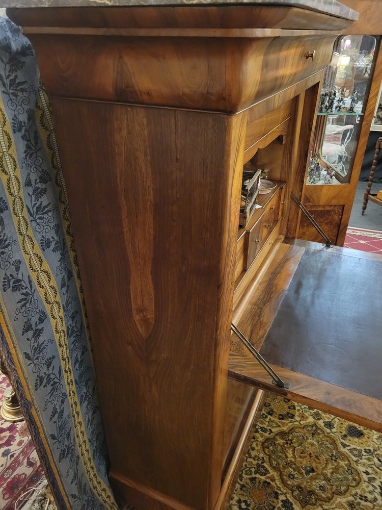 Secrétaire à doucine de style Louis-Philippe et d’époque XIXè. Placage de noyer et ronce de noyer. Plateau en marbre noir, théâtre garni de 8 tiroirs. 2 portes dans la partie basse ouvrant sur un rangement et un autre tiroir. L’ensemble fonctionne avec une seule clé . Tapis refait en cuir marron. Bon état général.
