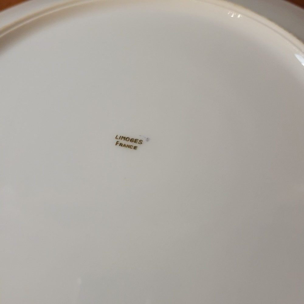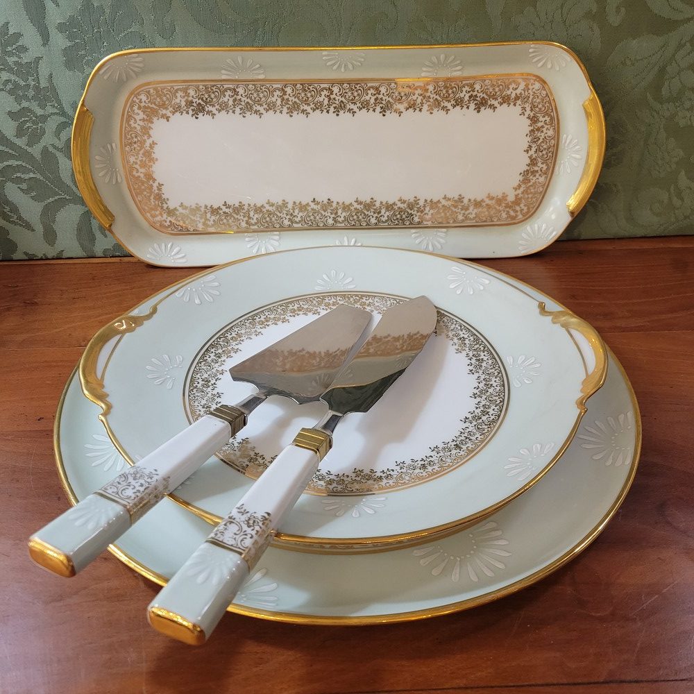 Service à dessert complet en porcelaine de Limoges, comprenant 12 assiettes, 1 plat à tarte, 1 plat à gâteau, 1 plat à cake, 1 couteau à gâteau et 1 pelle à tarte. Marli vert céladon réhaussé de doré et émaillé de fleurs stylisées blanches, typique des années 1950. L’ensemble est en parfait état avec de belles couleurs. (pelle et couteau en inox, très légèrement piqué et rayé)