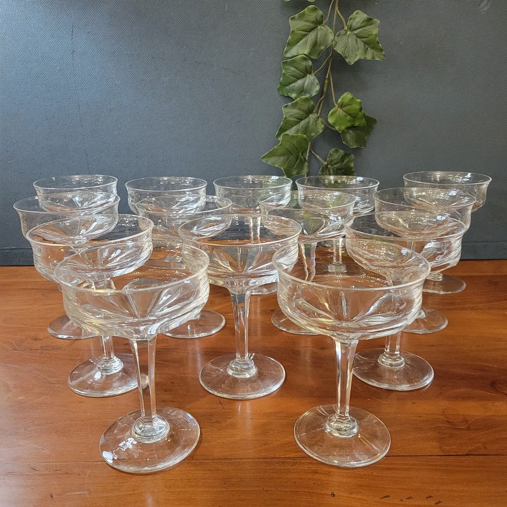 Partie de service de verres en cristal sans signature, légèrement facettés dans l’esprit Capri de Baccarat. Années 1950. Composée de 62 pièces : 14 grands verres, 16 verres à apéritif moyens, 18 verres à apéritif ou digestif plus petits et 14 coupes à champagne.