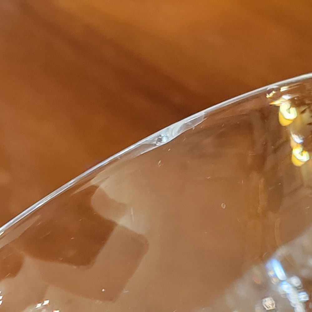 1 petit éclat sur un grand verre, et 3 sur les coupes. (cf. photo). Le reste est en bon état.