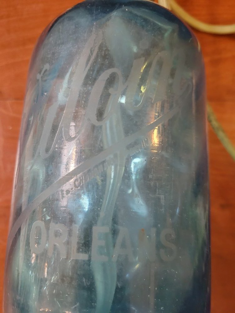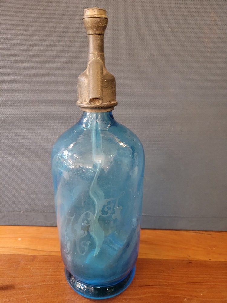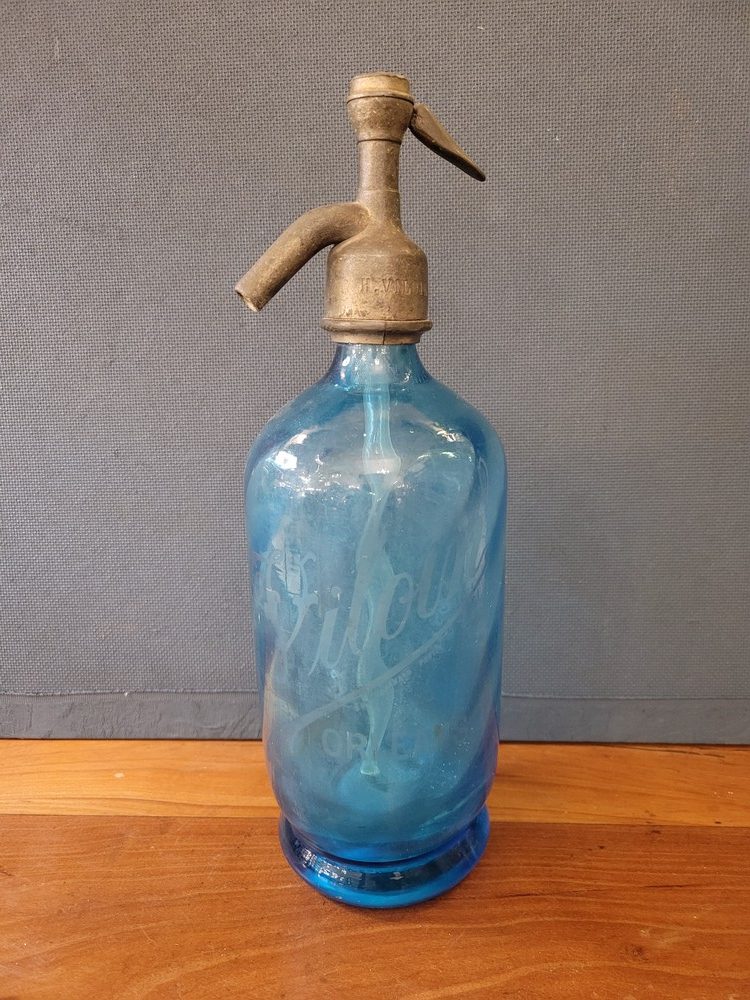 Ancienne bouteille siphon eau de Seltz en verre soufflé bleu gravé H.Viloin, Orléans. En bon état avec son tube en verre à l’intérieur.