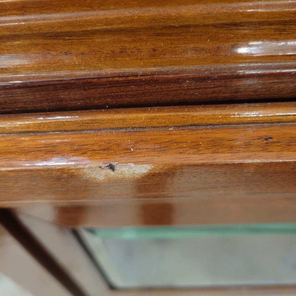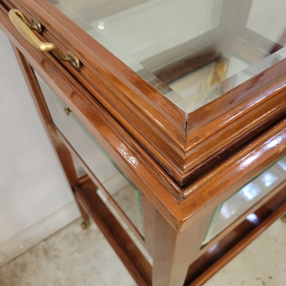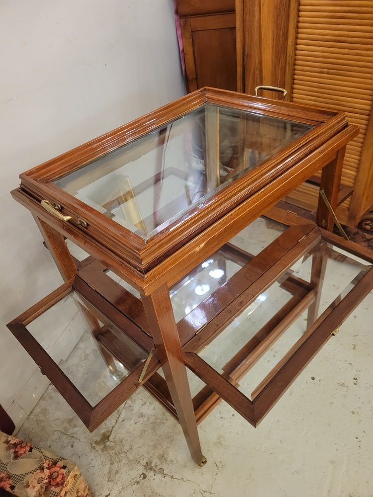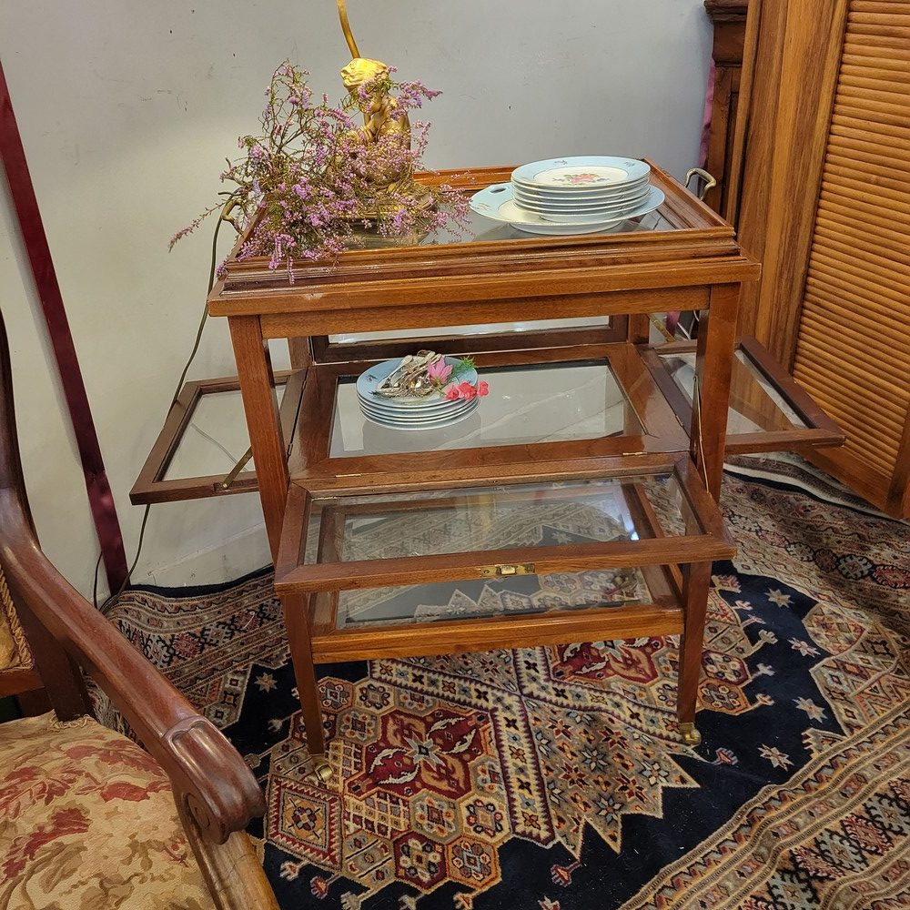 Table à thé ou table de pâtissier, en acajou verni, d’époque 1930 avec un plateau en verre amovible et 4 petites ailettes rétractables, également en verre. Montée sur roulettes, elle est facile à déplacer. Très pratique en desserte, ou petit meuble d’appoint. Bon état.