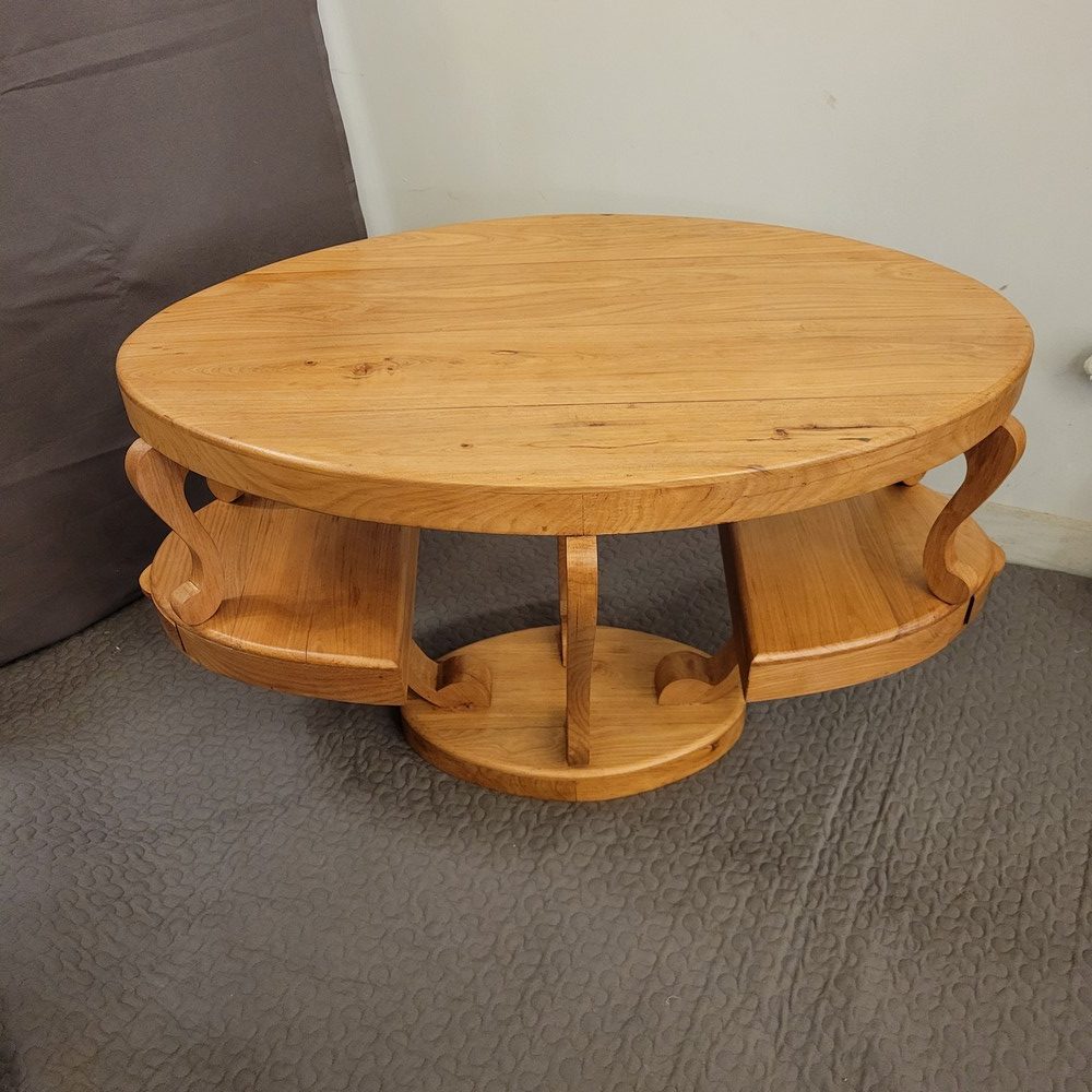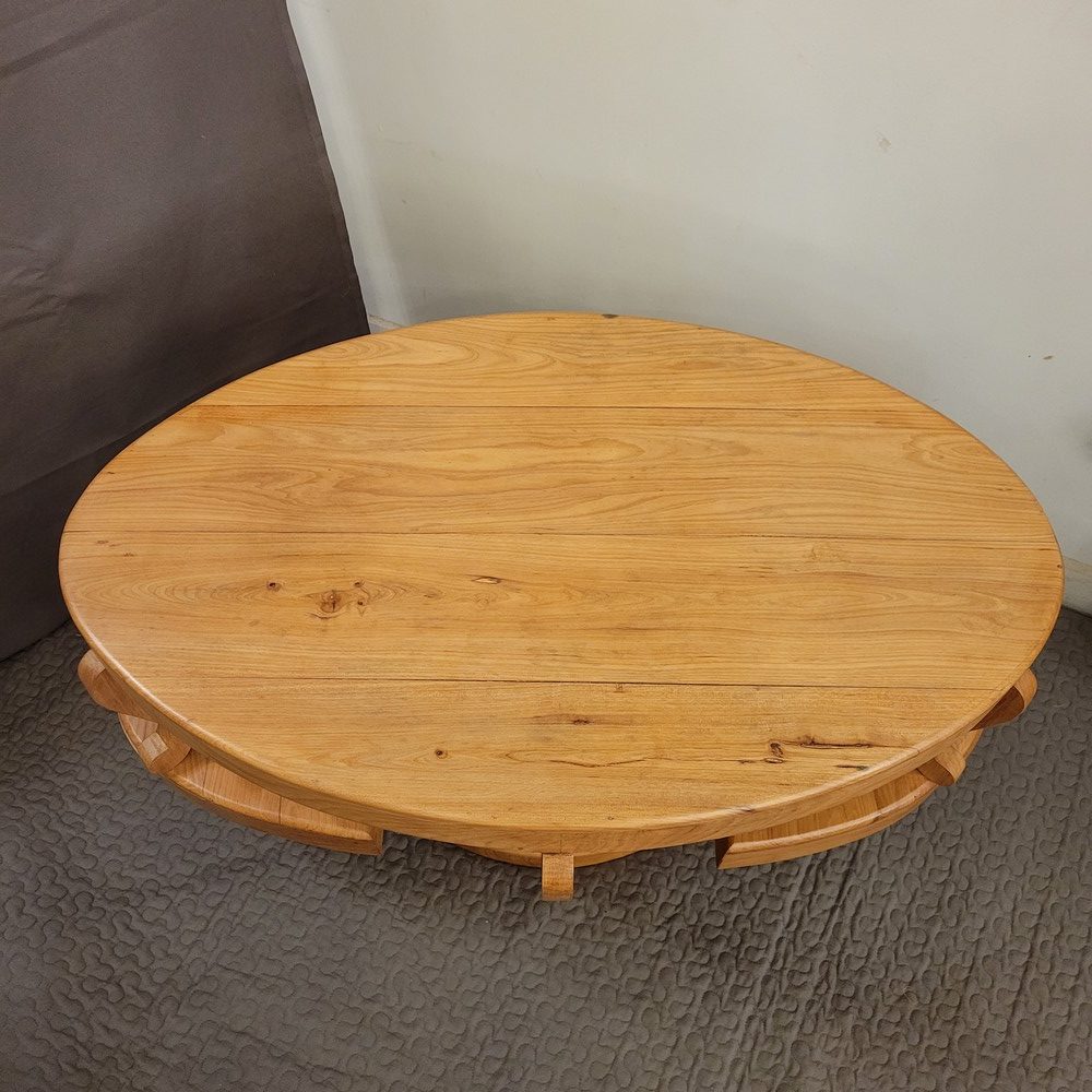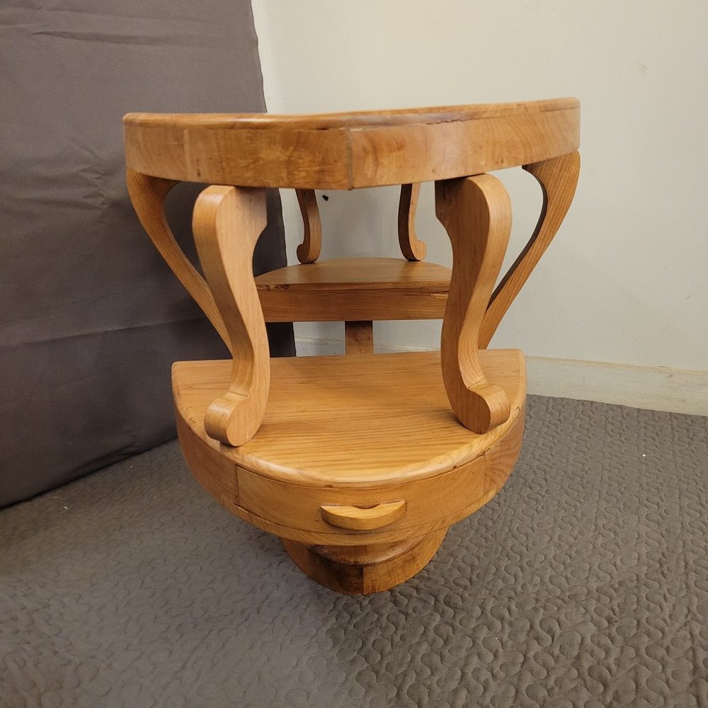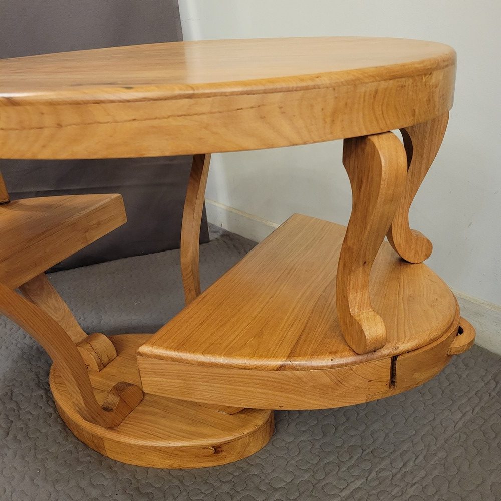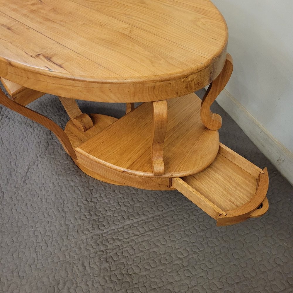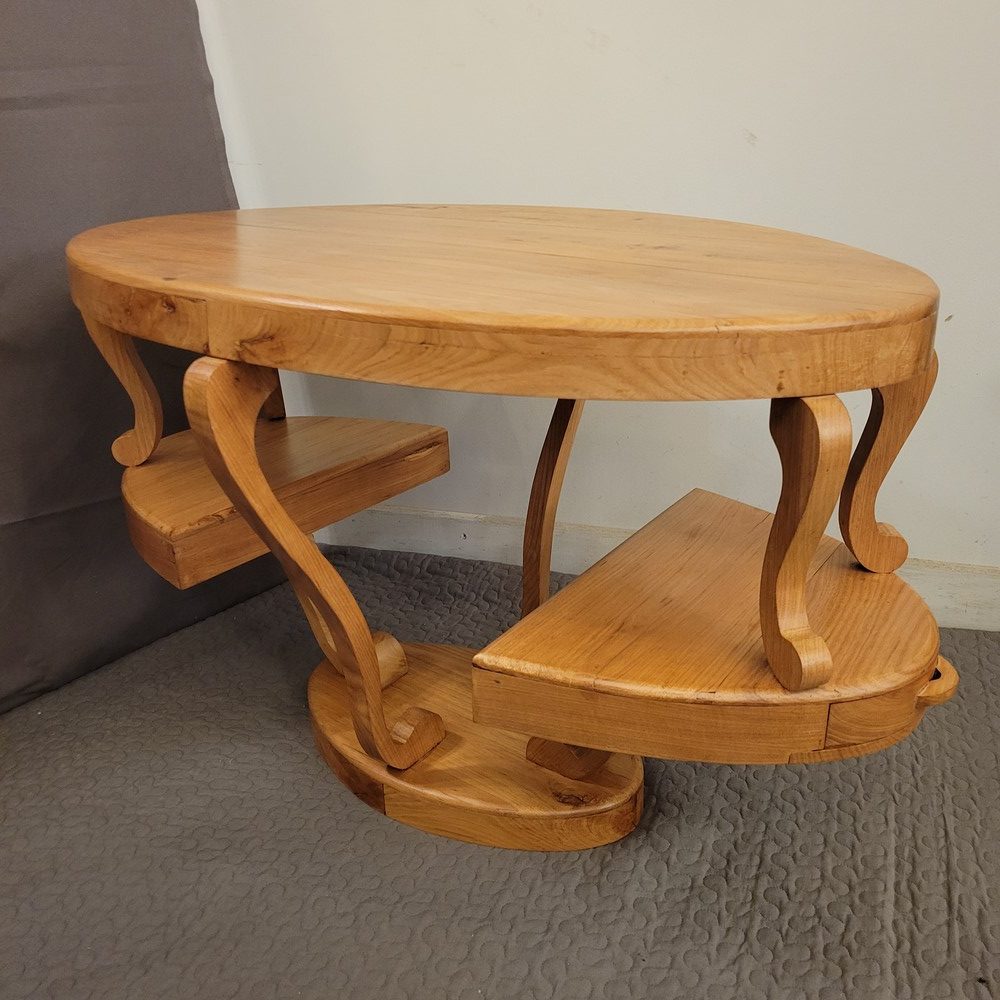 Table Basse de forme ovale à 2 niveaux, avec 2 petits tiroirs sur les côtés. En bois massif (frêne), d’esprit Art-Déco, ce meuble a été fabriqué dans les années 1990 par un ébéniste.