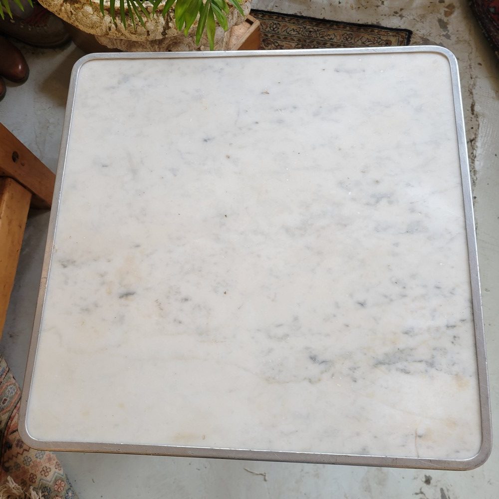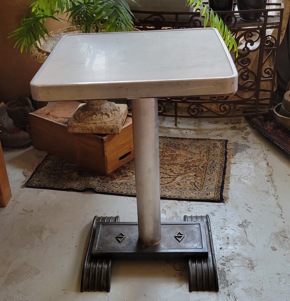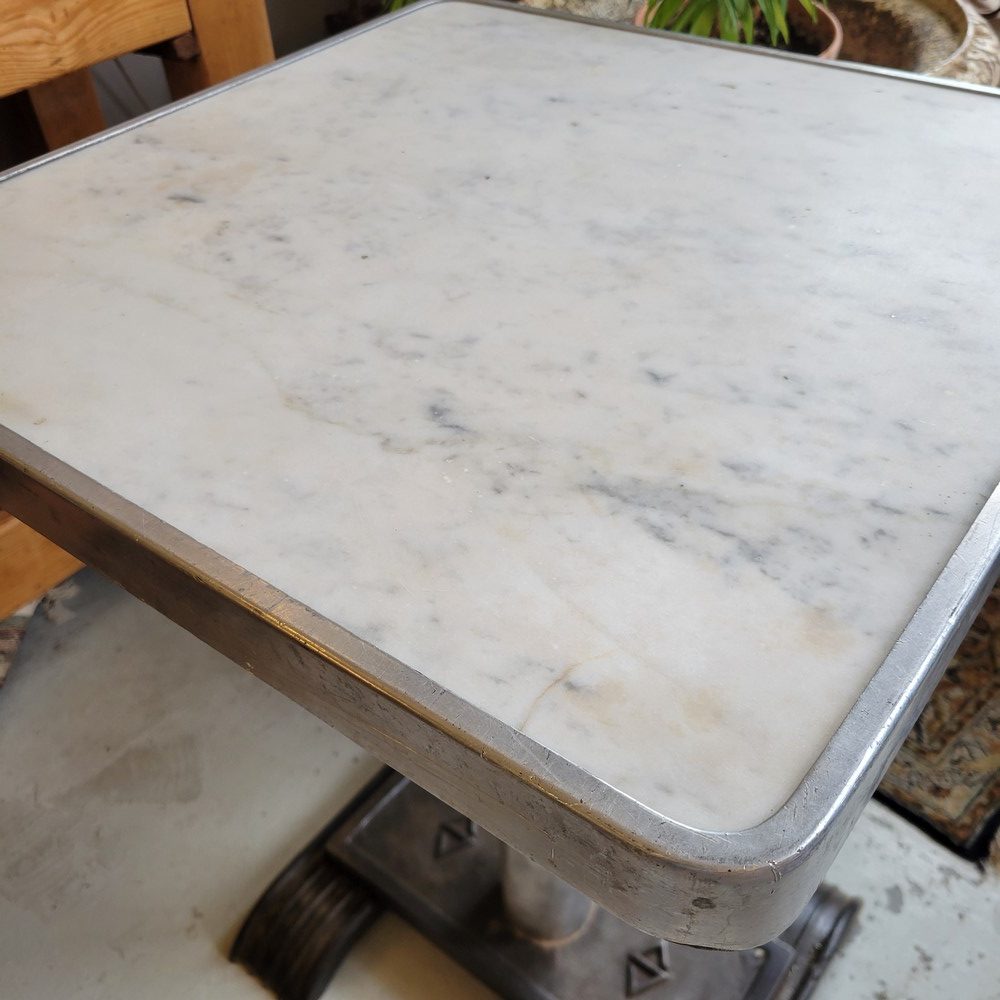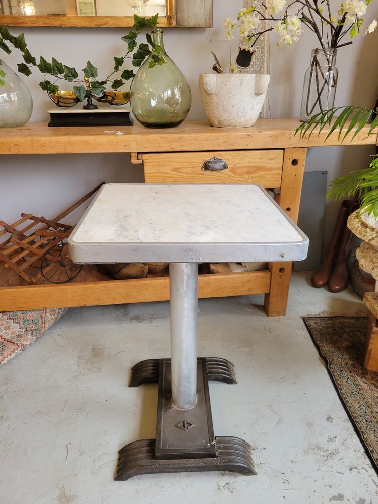 Table Bistrot carré avec un beau plateau en marbre blanc, cerclé de métal et un piètement en fonte, très lourd. D’époque 1930, elle est en bon état.  Elle peut s’utiliser en extérieur ou en intérieur.