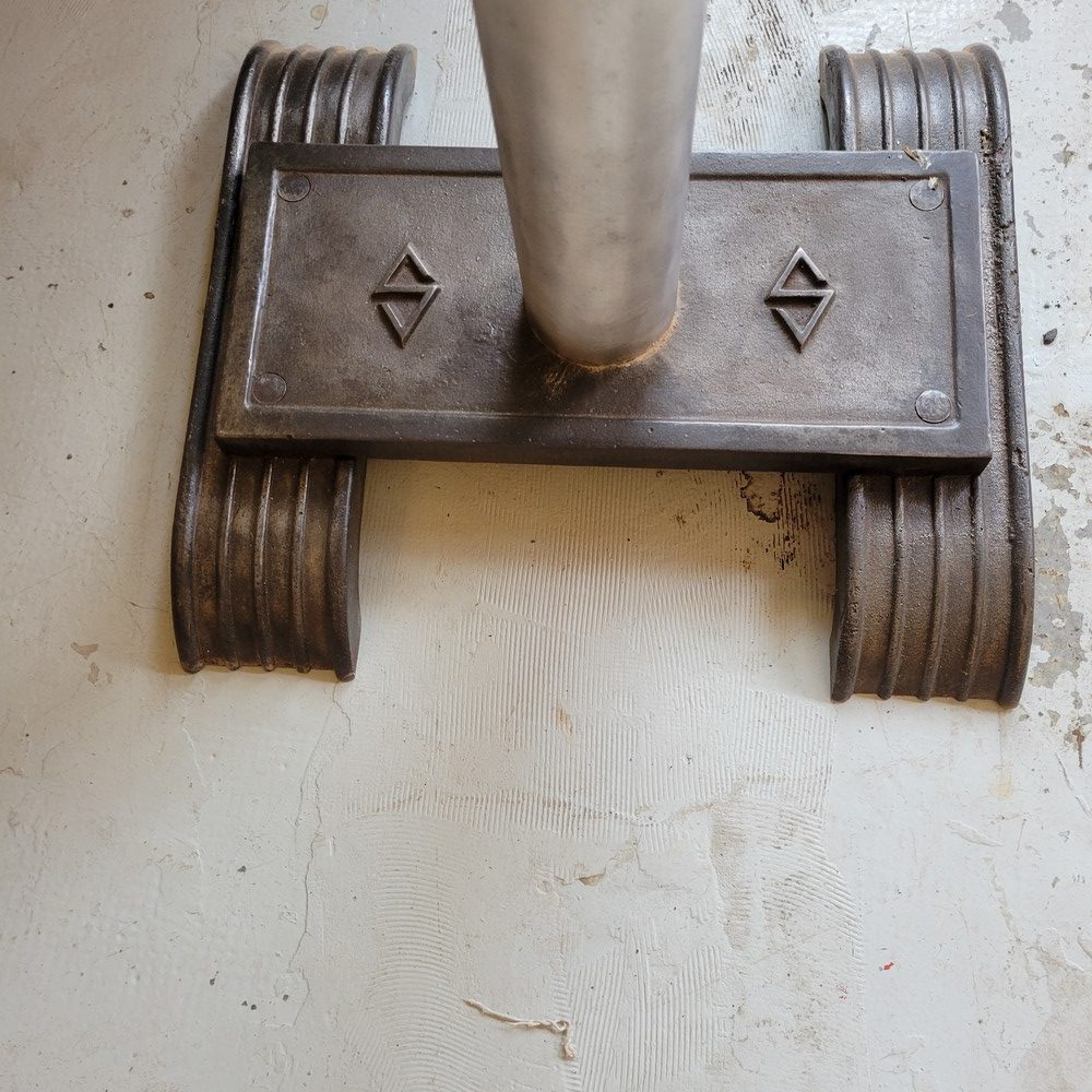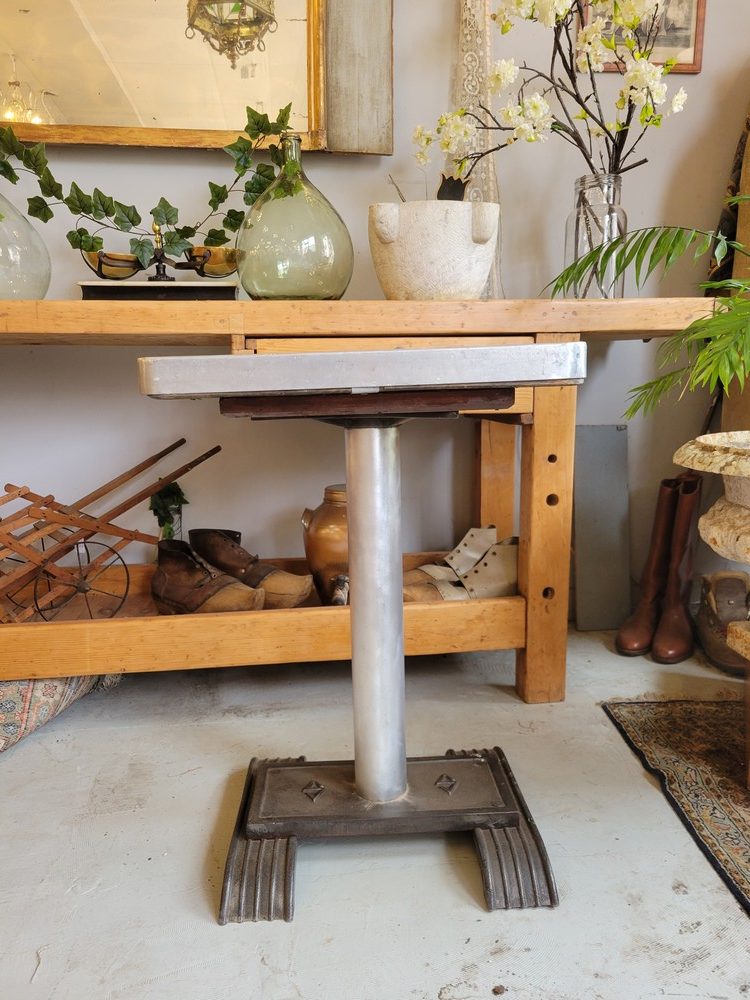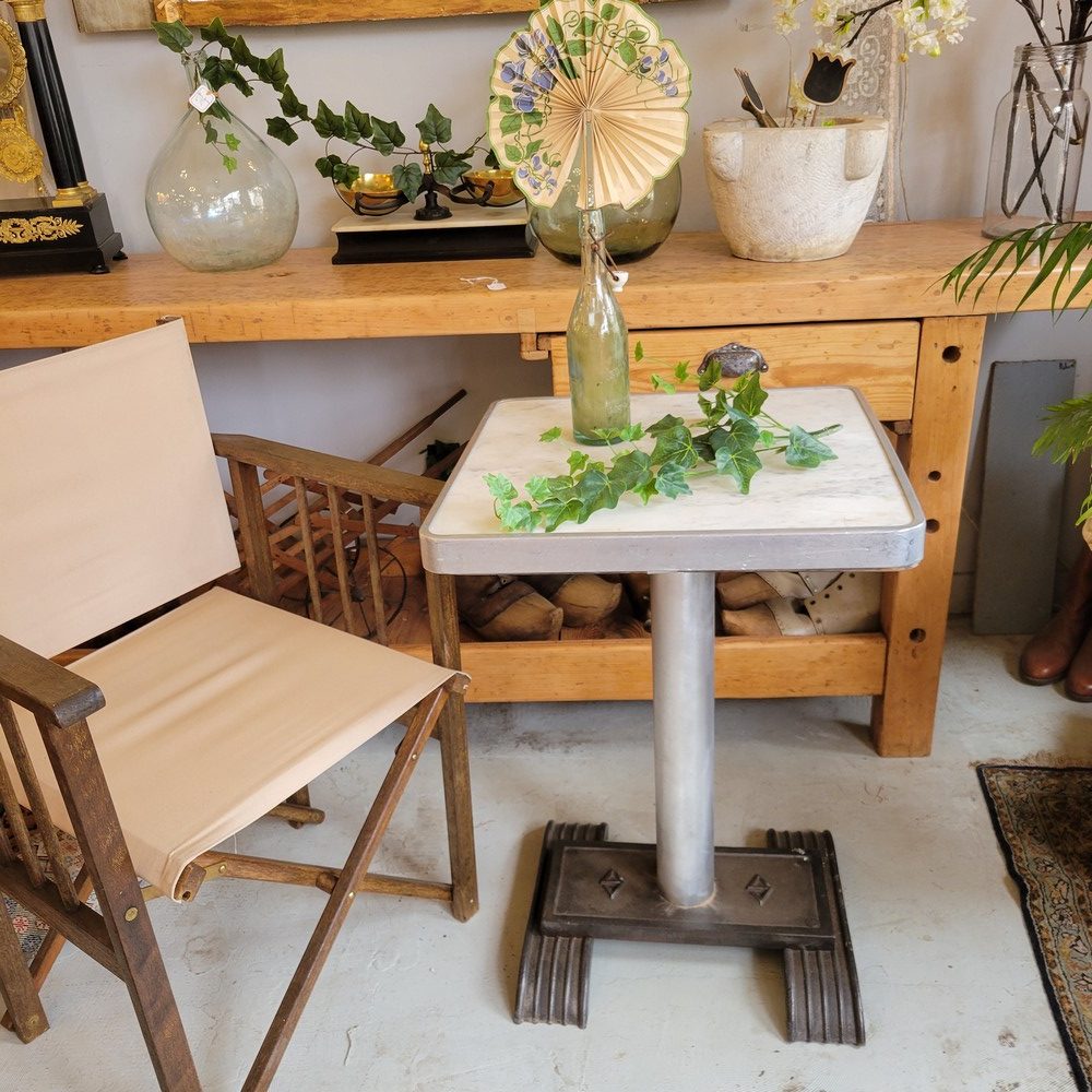 Table Bistrot carré avec un beau plateau en marbre blanc, cerclé de métal et un piètement en fonte, très lourd. D’époque 1930, elle est en bon état.  Elle peut s’utiliser en extérieur ou en intérieur.