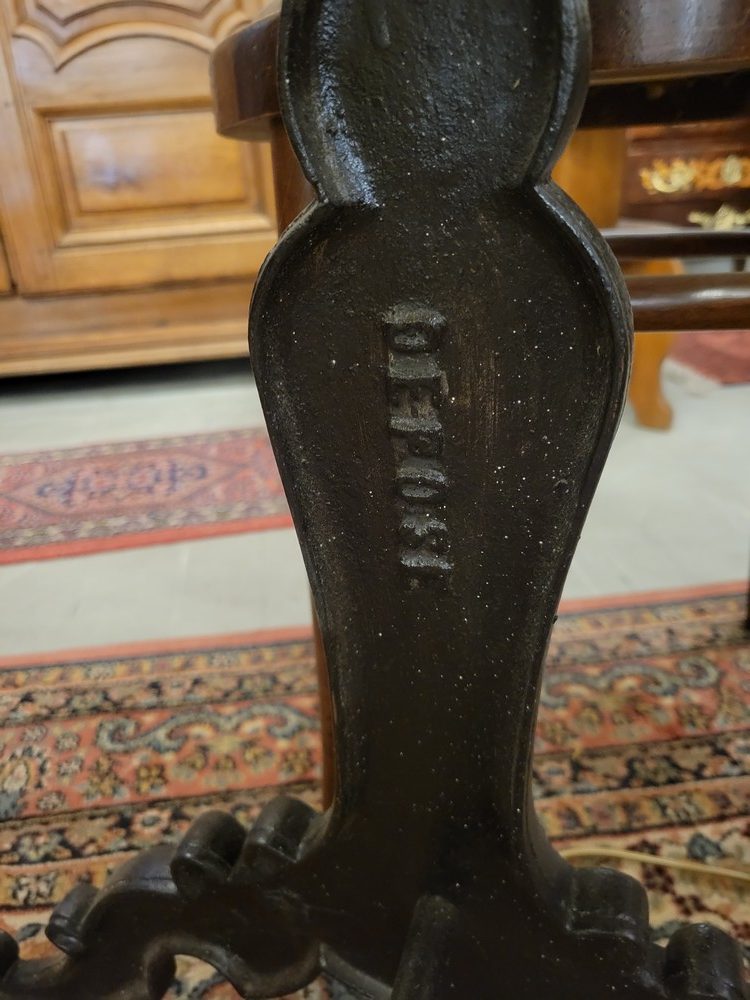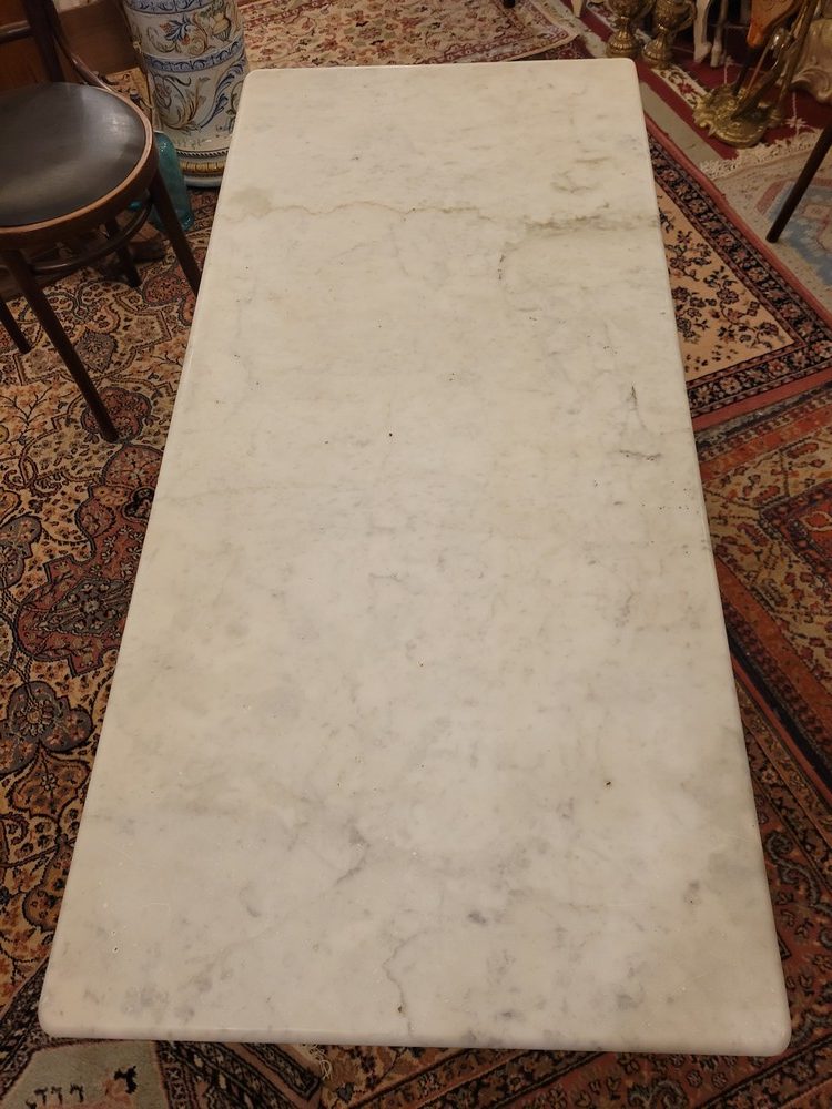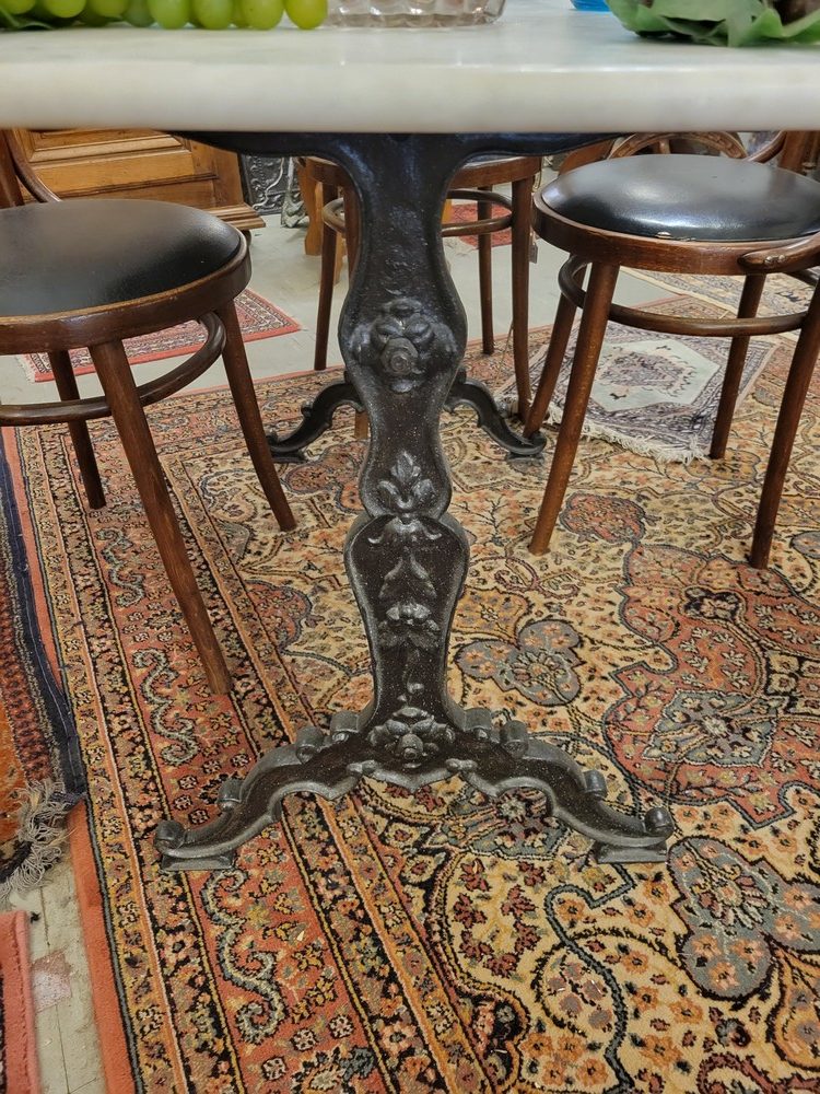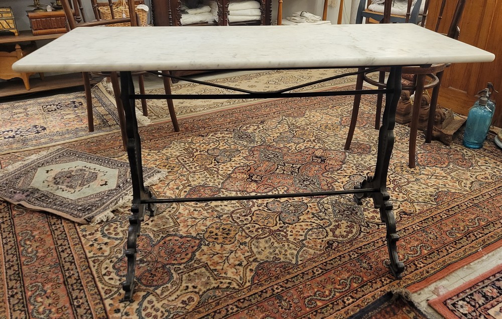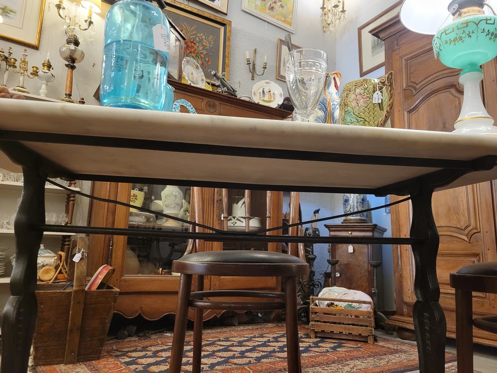 Table Bistrot rectangulaire avec un plateau en marbre blanc et un élégant piètement en fonte décoré. D’époque 1900, elle est en bon état. Le marbre n’est pas abimé, c’est une veine que l’on voit sue la photo. Elle peut s’utiliser en extérieur ou en intérieur. Marquée « Déposé ».
