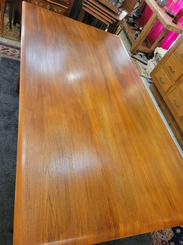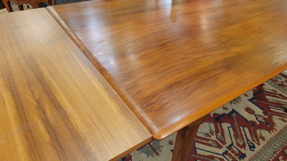 Table de salle à manger extensible. Style scandinave des années 1960. Elle est en teck verni. Table aux lignes pures très tendance et pratique. Les rallonges se déploient facilement. Bon état général.