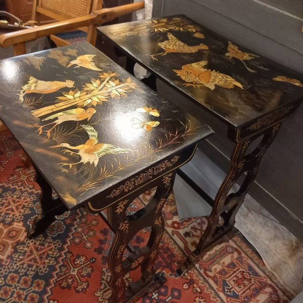 4 Tables Gigognes de style chinois, en bois laqué noir, avec de très beaux décors dorés de fleurs et d’ oiseaux. Les piètements travaillés sont particulièrement originaux. Ces petites tables sont parfaites en meuble d’appoint, faciles à transporter, selon les besoins et s’intègrent dans un décor moderne ou ancien.