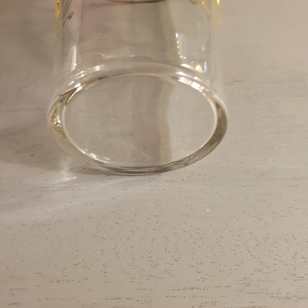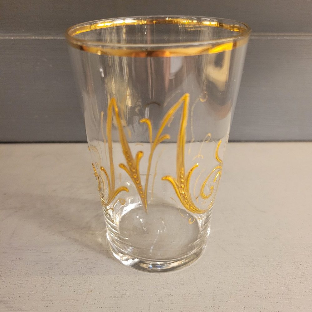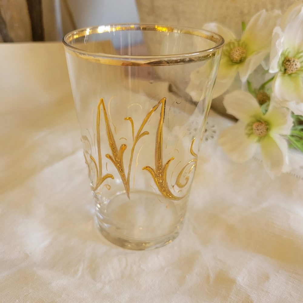Verre Ancien Monogrammé M, en verre soufflé transparent et émaillage doré. Bon état.