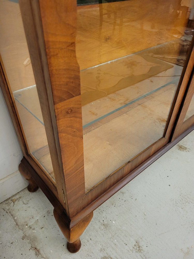 Vitrine-bar , des années 1950 en noyer plaqué. Le caisson supérieur s’ouvre en s’abattant et découvre un rangement à fond et plateau miroir (piqué). La partie basse présente 2 étagères en verres. Pratique pour ranger verres, bouteilles et carafes.